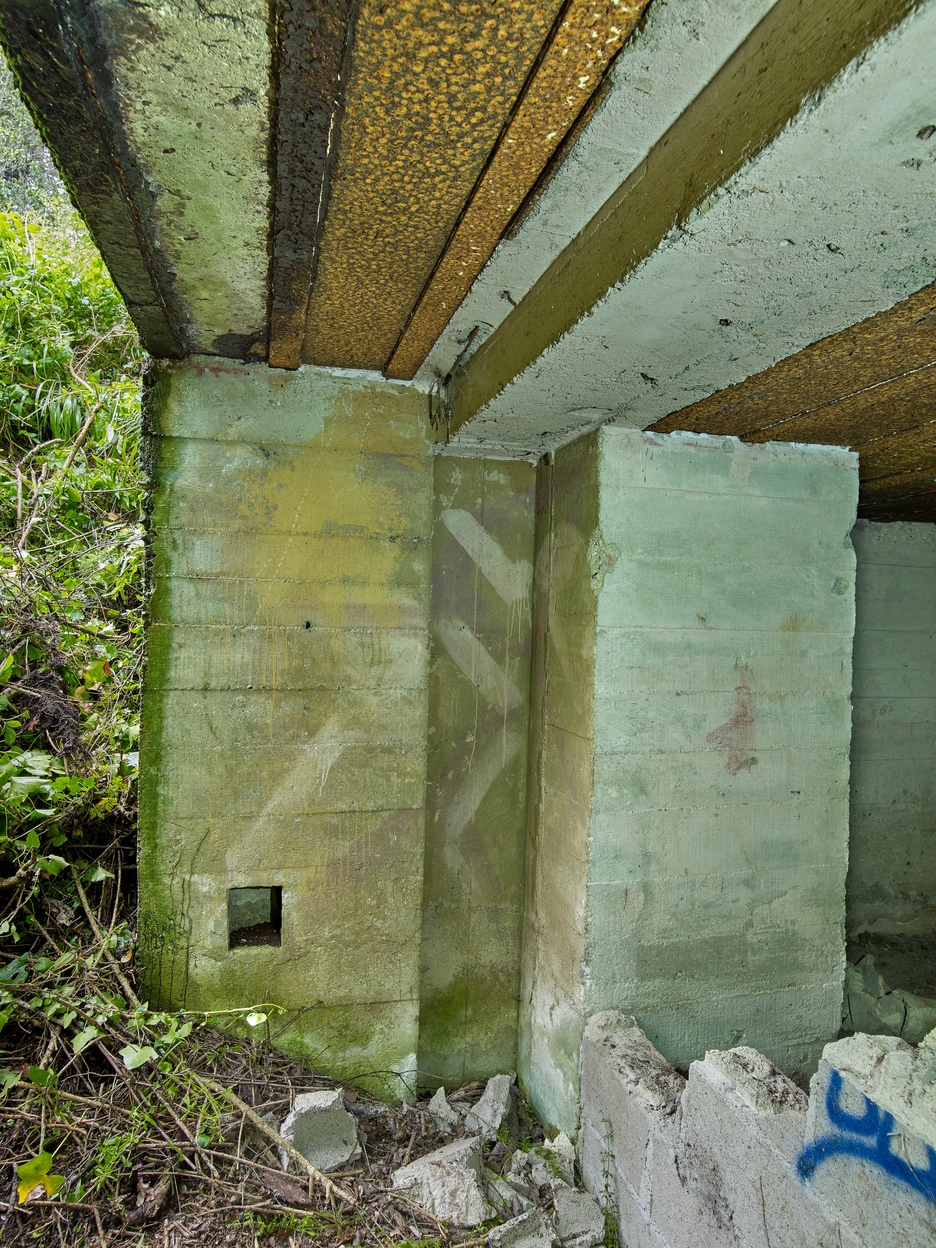 Vue de l'entrée (partiellement murée par des parpaings) : sur le mur Ouest, traces de peinture camouflageImmatriculation