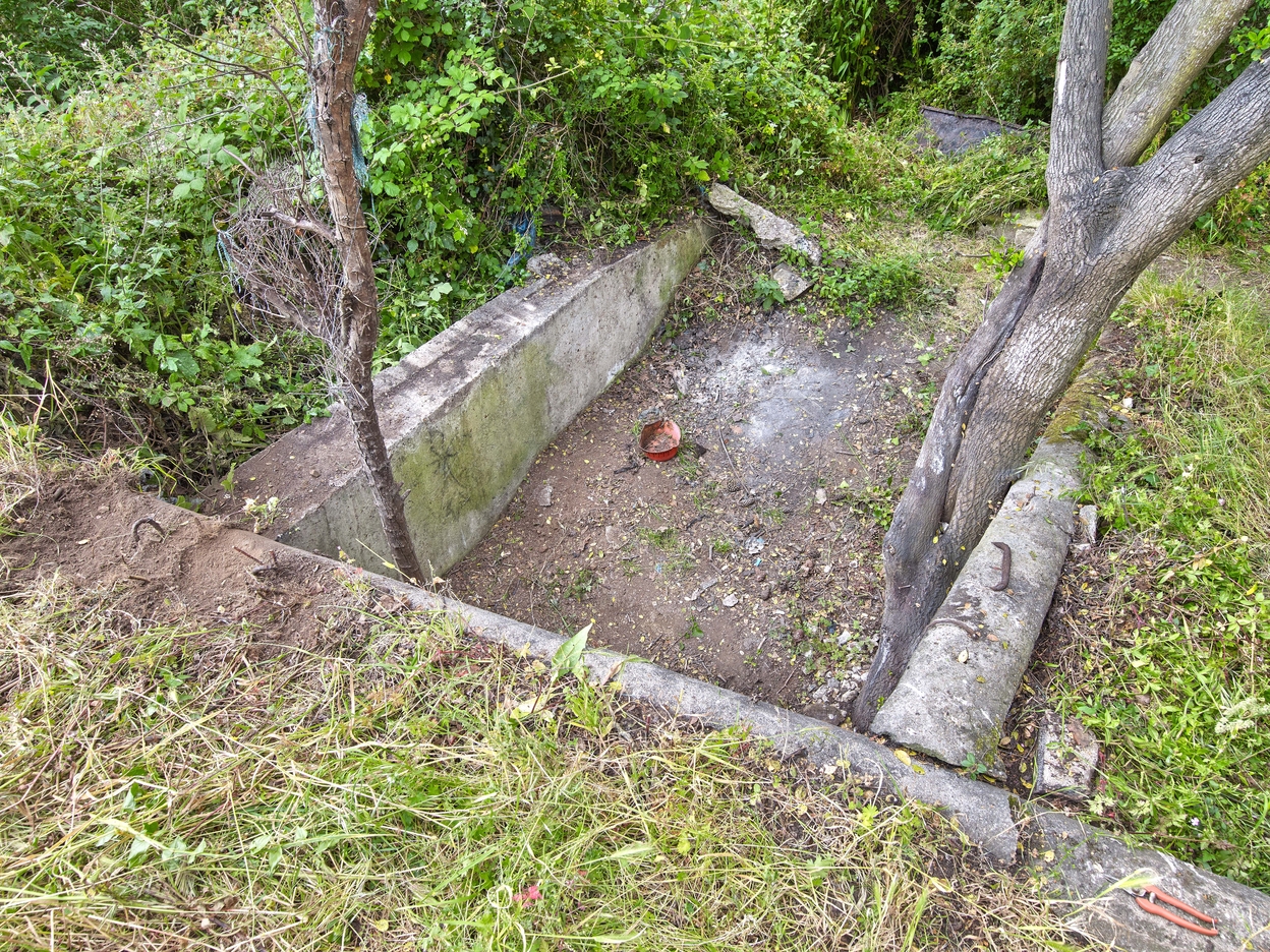Vue de la rampe d'accès depuis la dalle de couverture. Les murs latéraux protégent l'entrée. Plus on se rapproche de l'entrée, plus ils sont épais passant de 20 cm à 50 cmImmatriculation