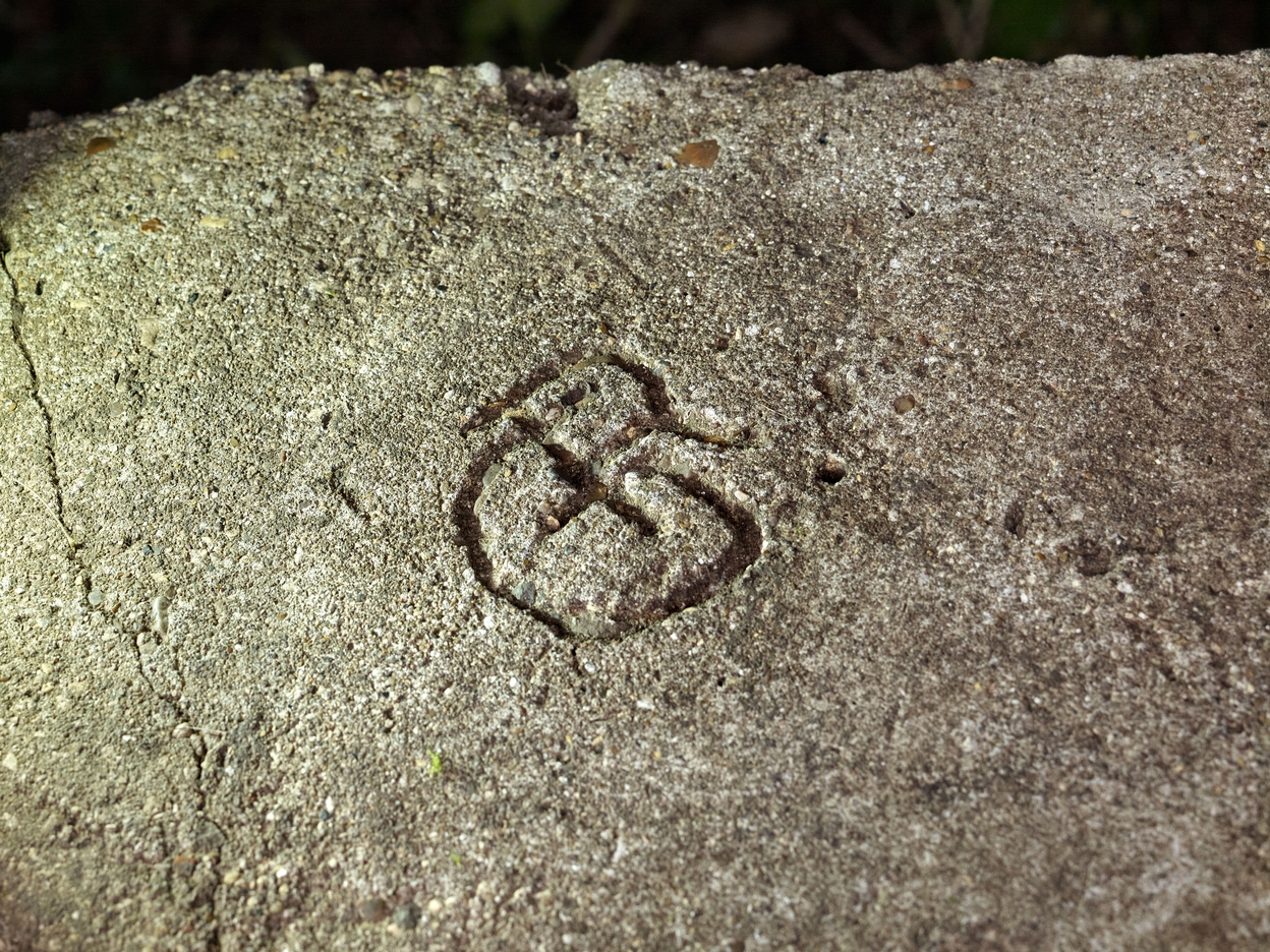 Vue du parapet du mur de clôture et de soutènement ceinturant le domaine : emplacement de tir situé à l'extrémité Est de la pointe près du bunker - casemate VF, inscription - acronyme dessinée dans le béton frais (initiales entrelacées GR pour Grenadier-Regiment, régiment de grenadier ?)Immatriculation