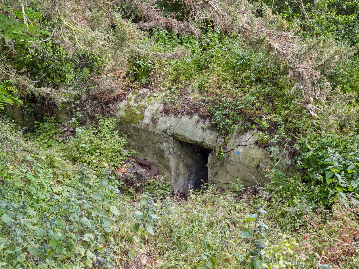 Vue de l'entrée Sud (partiellement murée par des parpaings et remblayée) avant débroussaillage. Ce type de bunker est dotée de deux entrées. La tranchée d'accès a été remblayéeImmatriculation