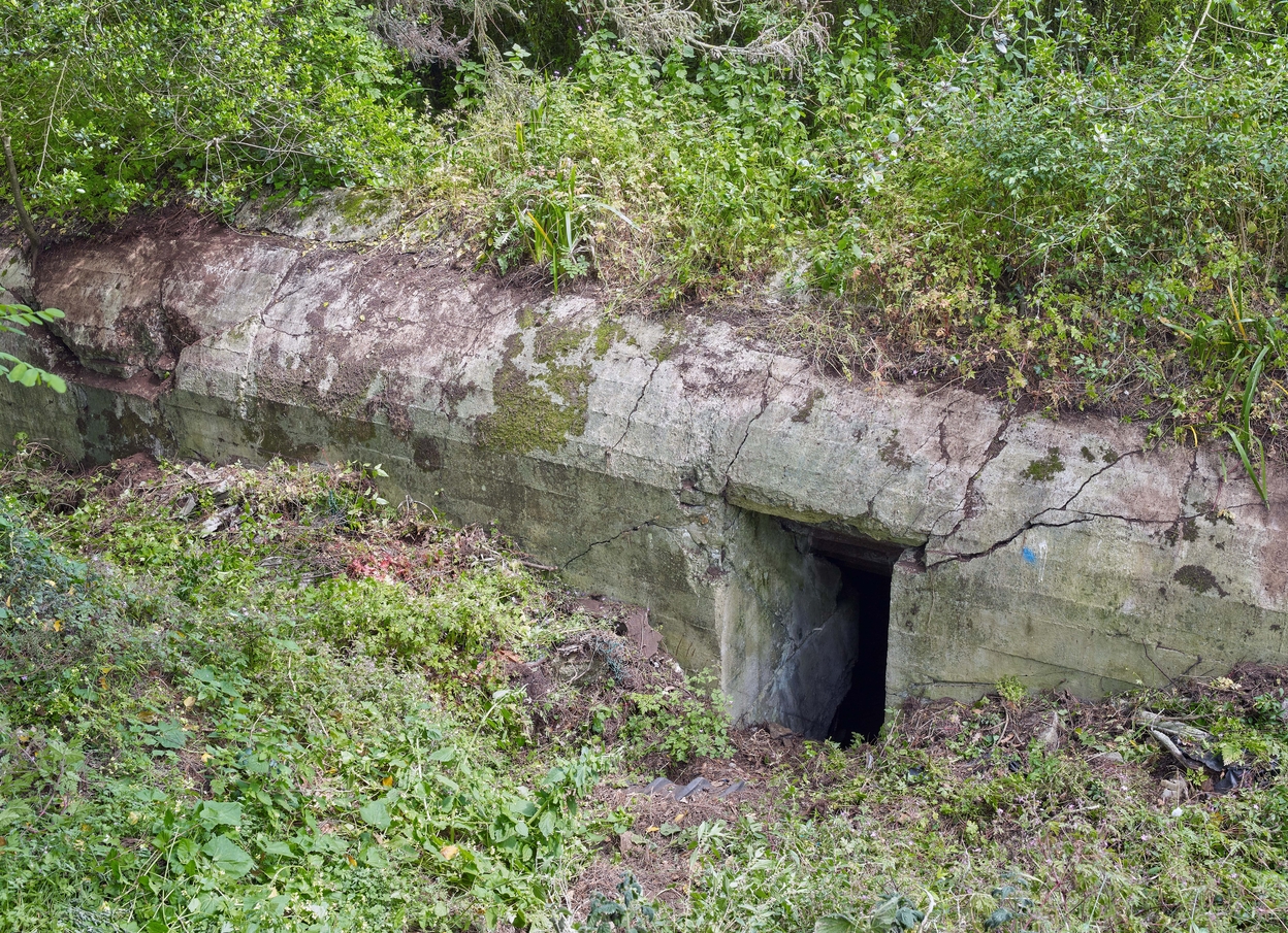 Vue de l'entrée Sud (partiellement murée par des parpaings et remblayée) après débroussaillage. Ce type de bunker est dotée de deux entrées. La tranchée d'accès a été remblayéeImmatriculation