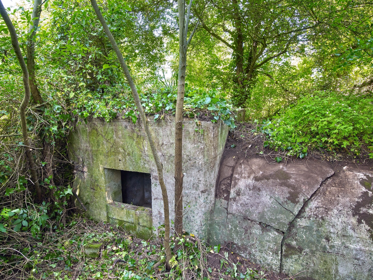 Vue du bunker - poste d'observation et de tir de type 58c dit Tobruk-Stand Est, accolé au bunker - abri de type 502 situé à l'extrémité Est de la pointe : entrée. Son entrée est partiellement murée par des parpaings. La tranchée d'accès des deux bunkers est remblayée par des déchetsImmatriculation