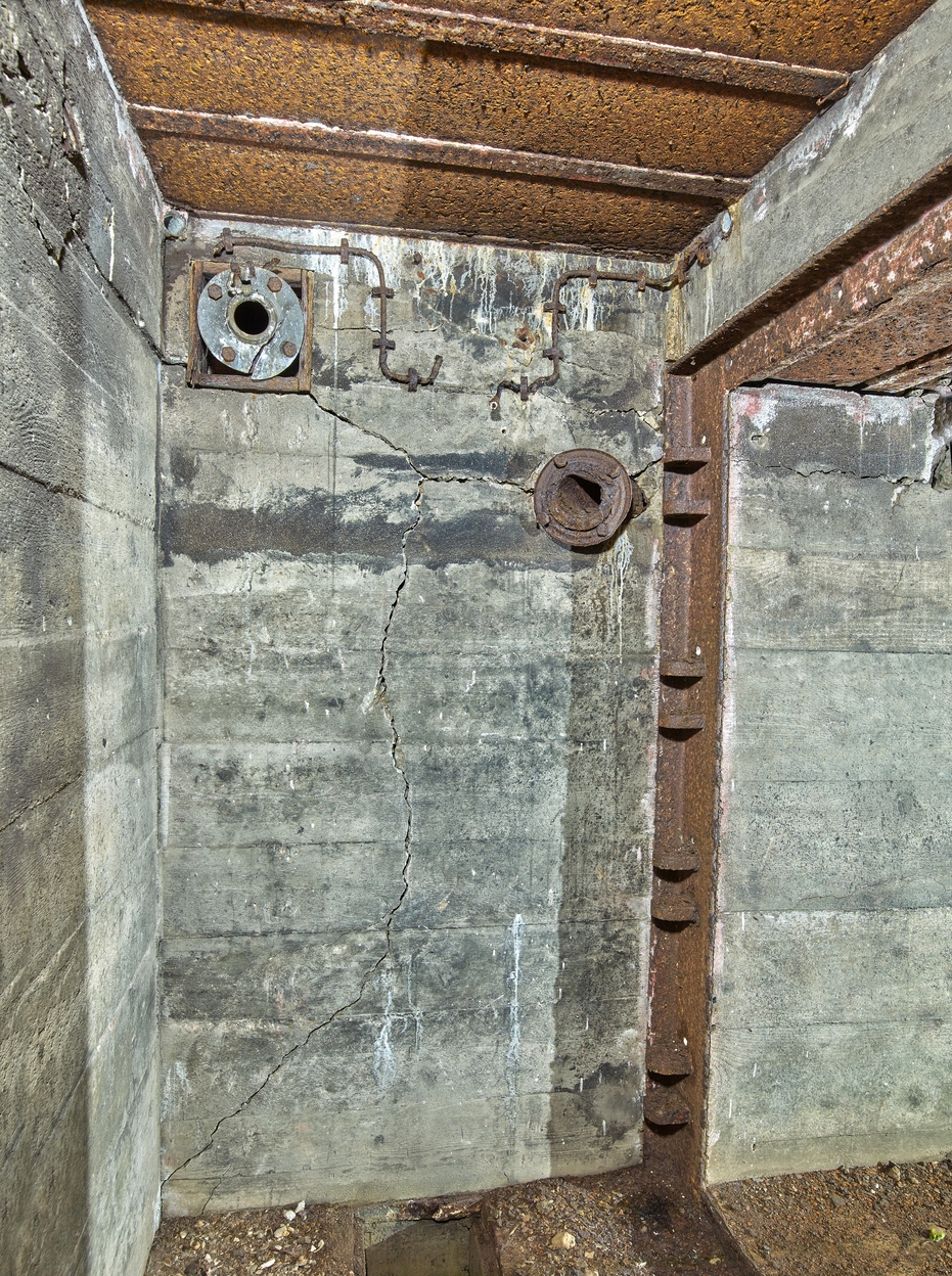 Vue de la petite pièce dédiée au périscope : sur le mur, clapet de surpression en aluminium, bouche de soufflage et câblages (prises disparues). Cette petite pièce dite pièce périscopique était protégée par une porte blindée (disparue)Immatriculation