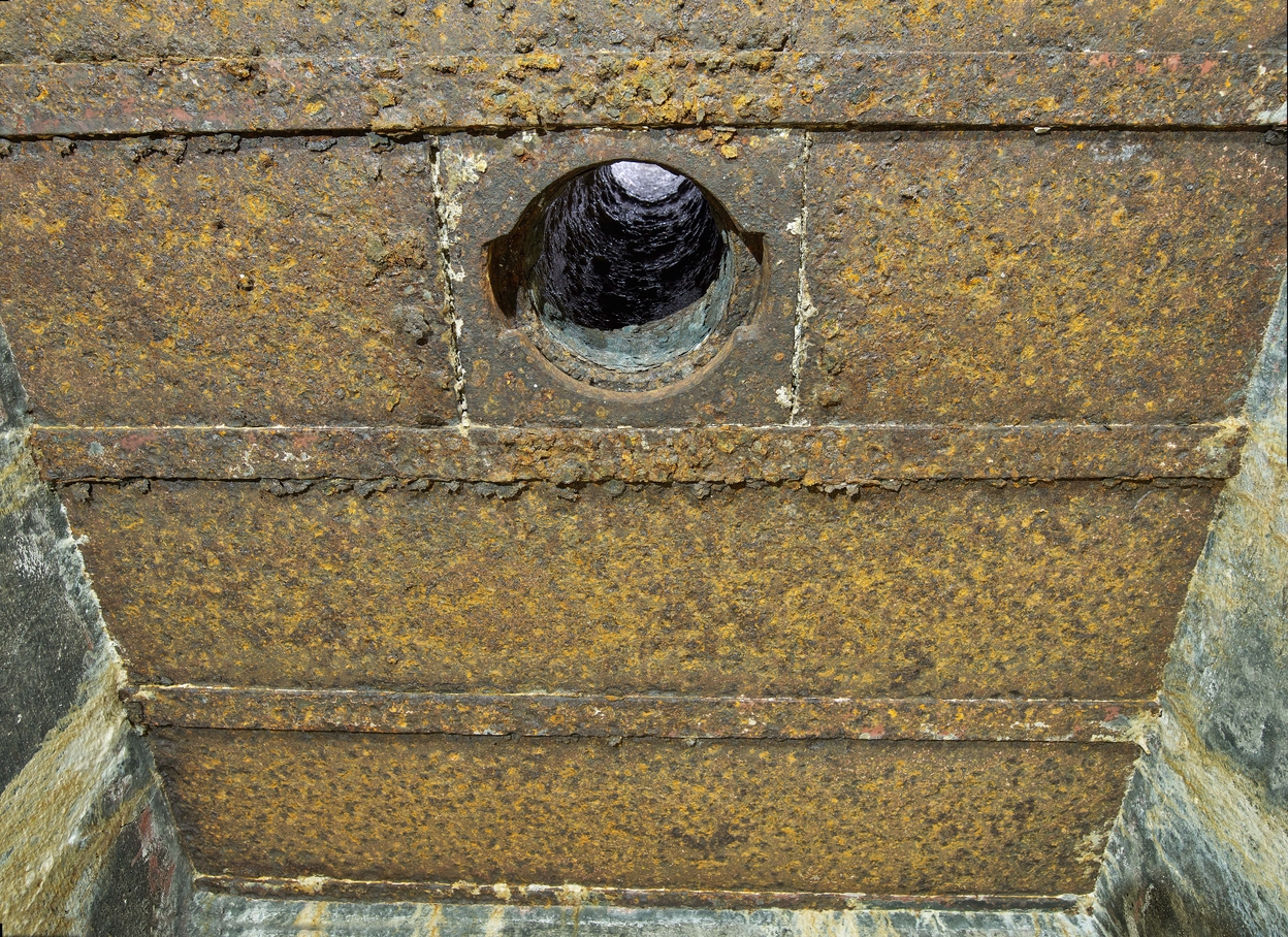 Vue du puits du périscope. Il est situé dans une petite pièce dédiée dite pièce périscopique protégée par une porte blindée (disparue)Immatriculation