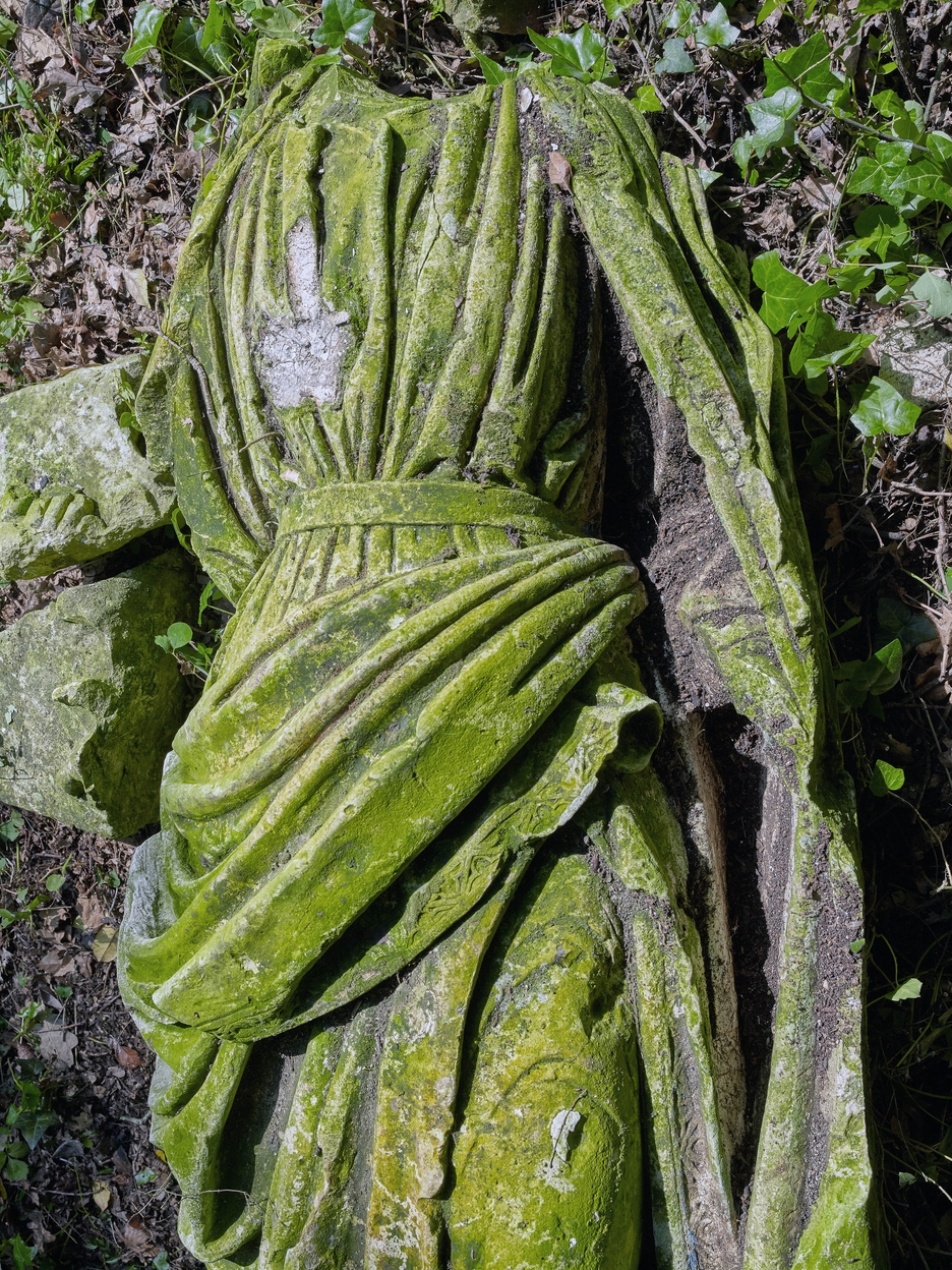 Vue de l'une des statues du jardin d'agrément. Couchée sur le sol près de la porte ornementale basse, son socle se trouve à proximité immédiate. Elle a perdu sa tête et l'extrémité de ses piedsImmatriculation