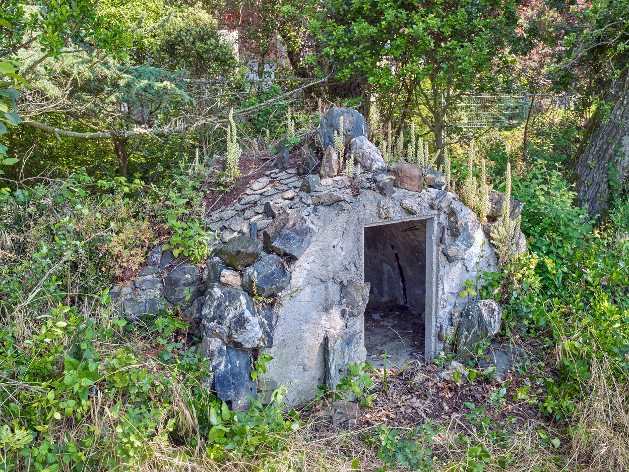Vue de la grotte artificielle (faisant abri pour un ou des animaux) du bassin : élévation Sud percée d'un porte. Sa couverture est ornée de coquilles Saint-Jacques en ciment et de rocailleImmatriculation