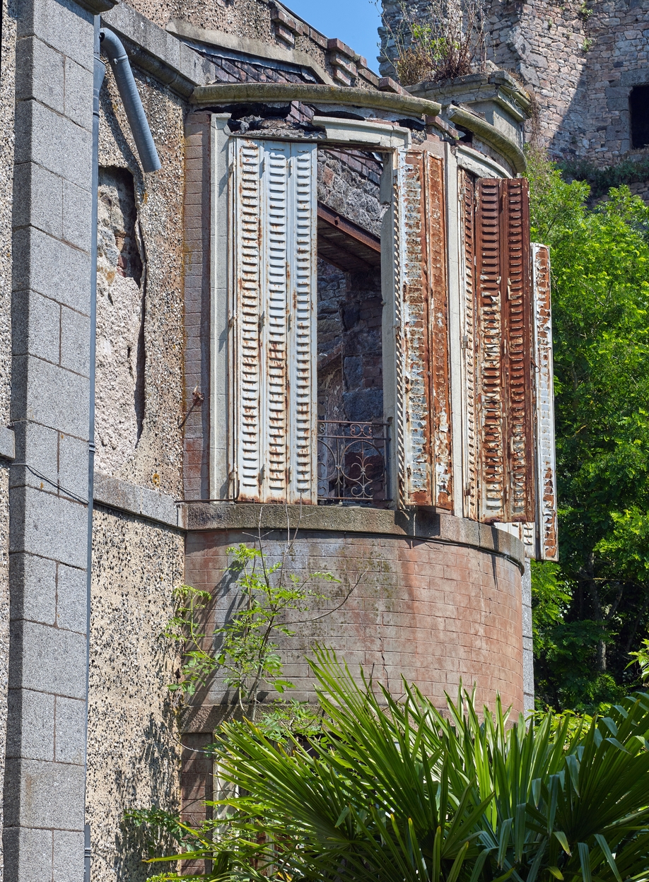 Vue de l'élévation Sud-est : fenêtre en encorbellement (bow-window) du premier étage. Les volets métalliques sont toujours en place après l'incendieImmatriculation