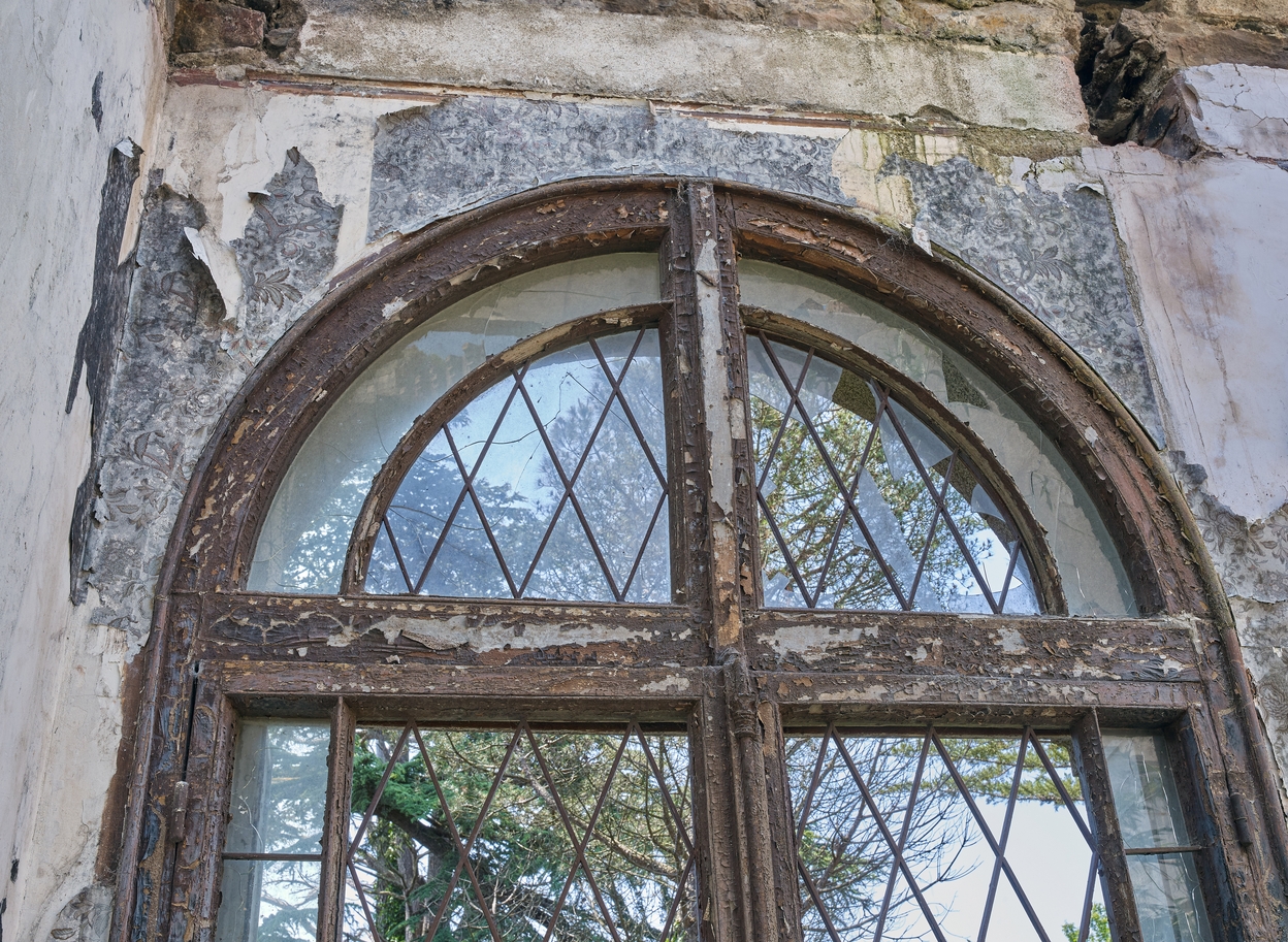 Vue intérieure : grande salle côté Sud-Ouest, vestiges d'une huisserie, porte-fenêtre en arc plein cintre et vitraux. Sur le mur, papier peint aux motifs florauxImmatriculation