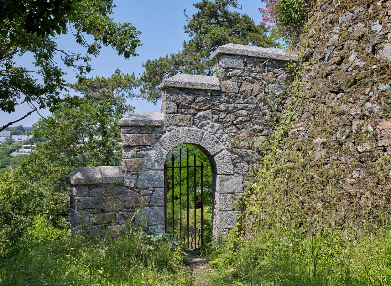 Vue du belvédère de jardin dit Tour Malakoff : mur et porte en arc plein cintre fermée d'une grilleImmatriculation
