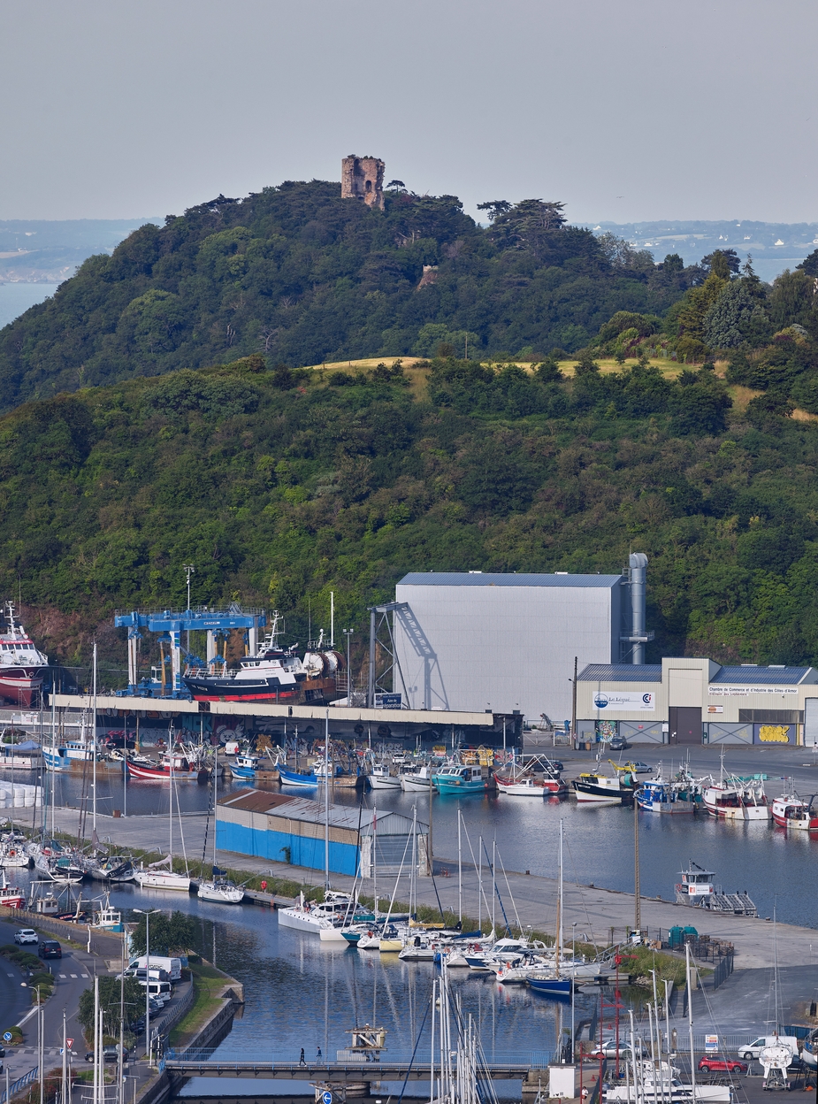 Vue de situation depuis le pont de la route nationale n° 12 franchissant le Légué. Au premier plan, le port du Légué ; à l'arrière-plan, la Tour de Cesson qui émerge de la cime des arbres. On apperçoit également le belvédère crénelé dit Tour MalakoffImmatriculation