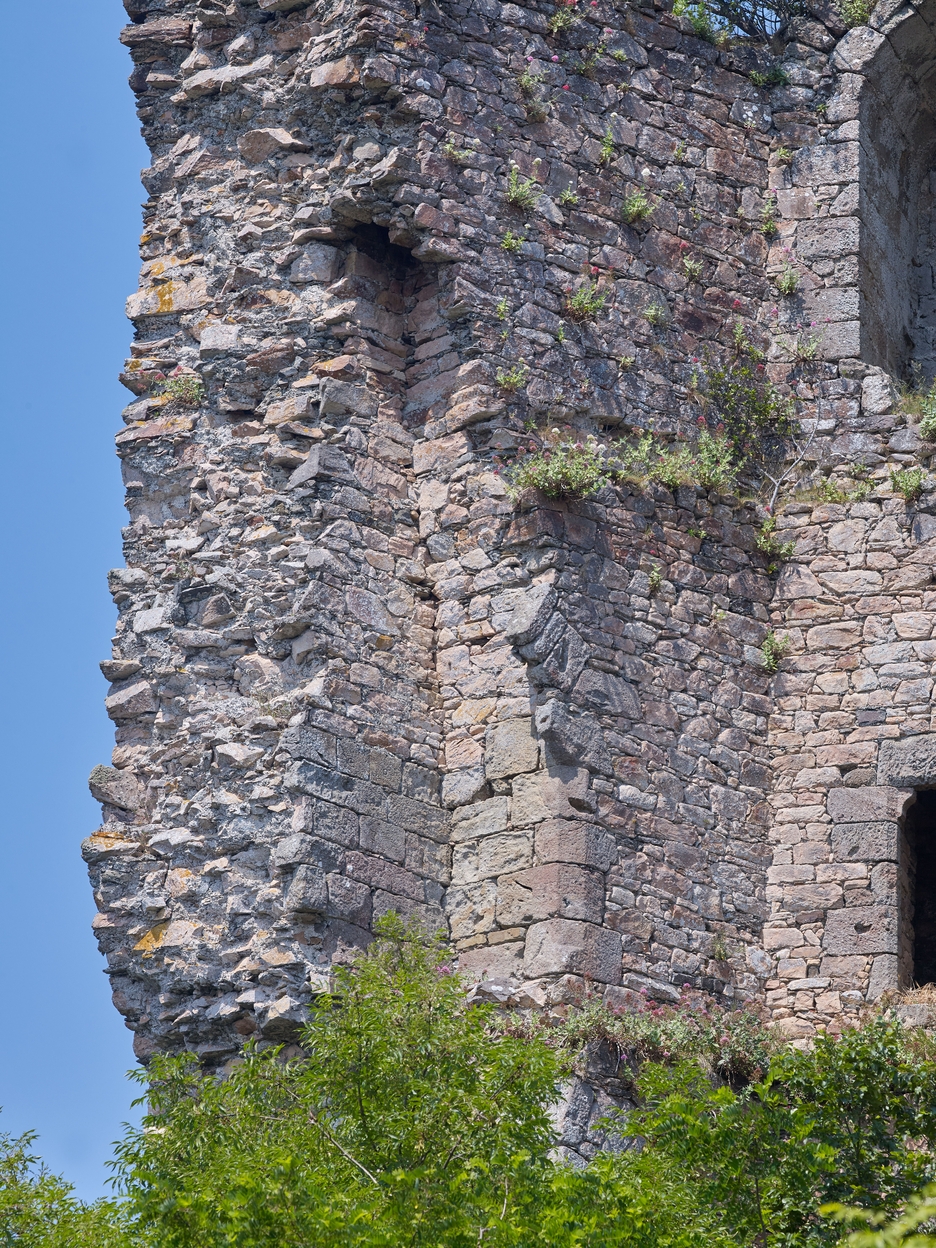Vue des 2ème et 3ème étages : emplacement de la cheminée du 2ème étage et de son conduit. On voit le piédroit à chanfrein plat de la cheminée ; le coeur ou foyer est en pierre de taille (certaines pierres portent des marques de tâcheron)Immatriculation