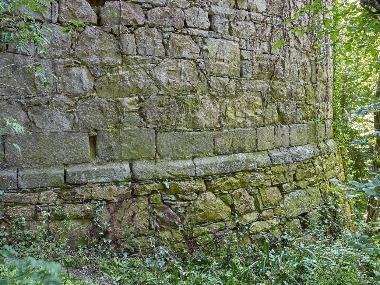 Vue du parement au Nord. Un bandeau continu et une assise en pierre de taille marquent la différence entre la tour (verticale) et le pied de la tour (avec fruit)Immatriculation