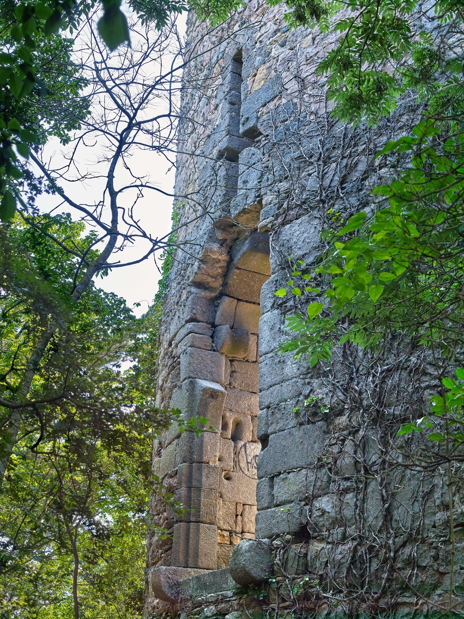Vue générale de l'entrée orientée vers l'Est-nord-est. L'entrée de la tour était défendue par un pont-levis à flèche unique - dont on voit la rainure - suspendant la passerelle/le pont. Les pierres en saillie accueillaient les tourillons du pontImmatriculation