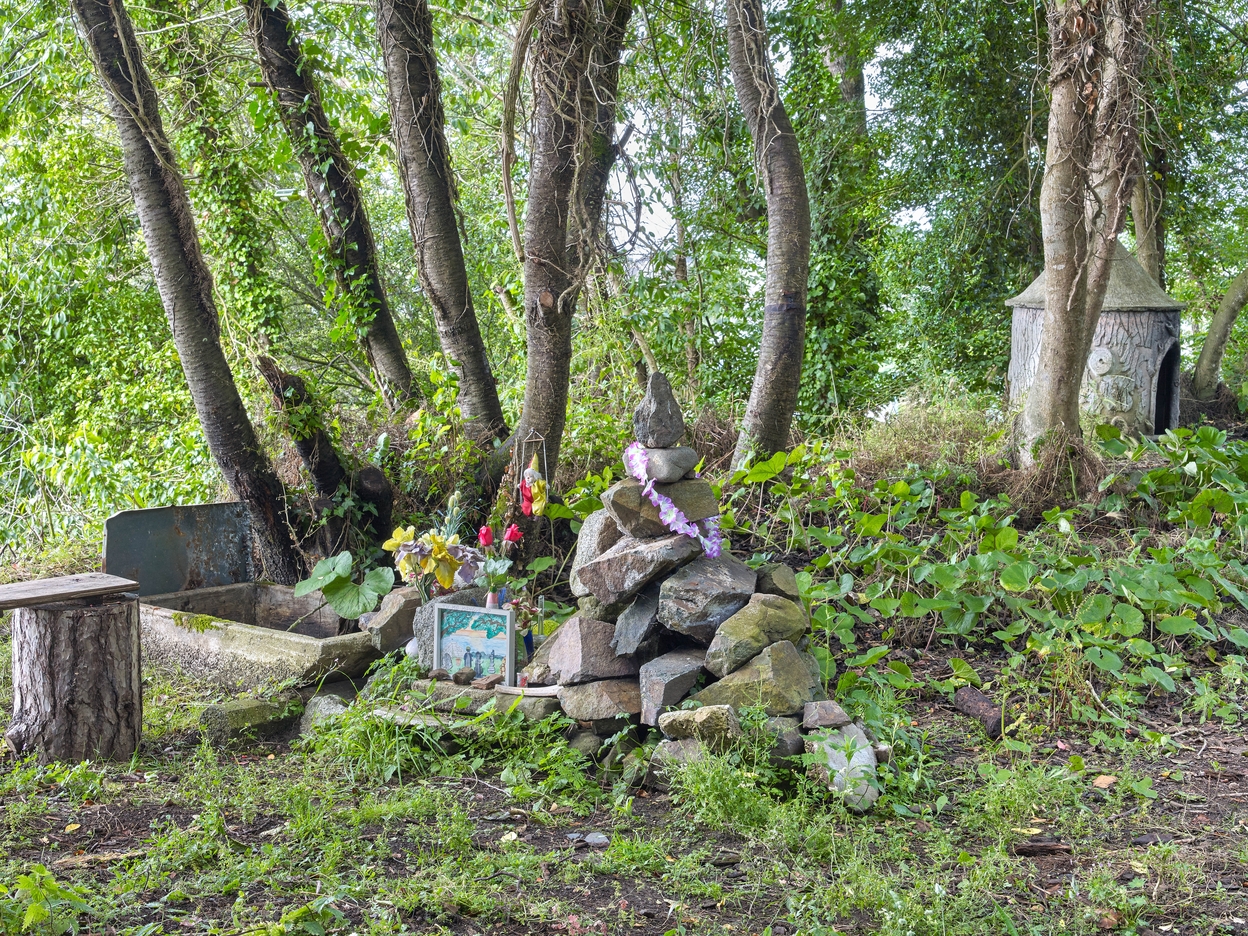 Vue de la tombe fleurie et décorée du chien de monsieur X, squatteur du Domaine de la Tour de Cesson. En arrière plan, la niche du chenil en faux boisImmatriculation