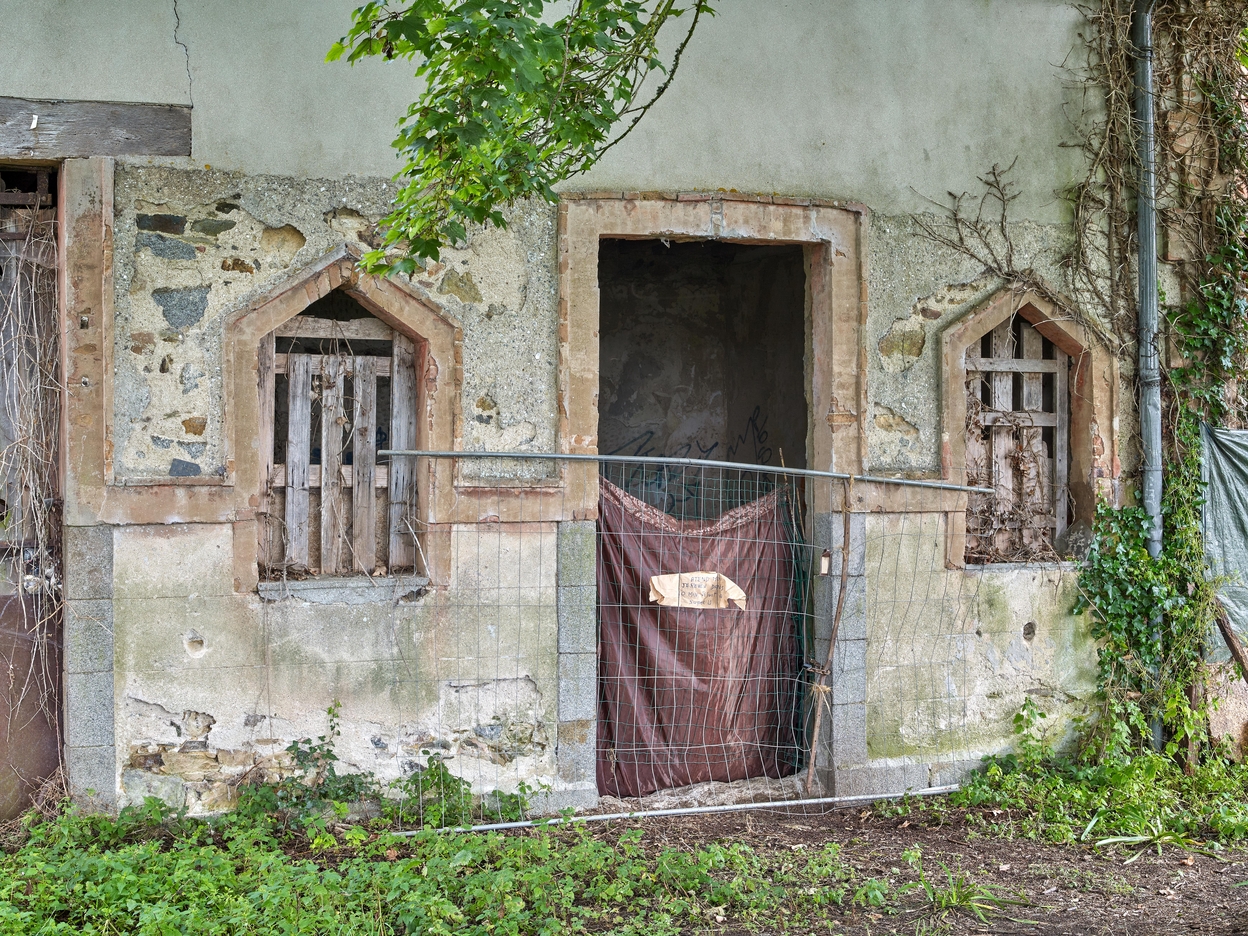 Vue des communs et dépendances : élévation sud, écurie Est. A signaler, la forme triangulaire des fenêtres encadrant la porte rectangulaire ; le jeu de couleur entre granite gris, brique et enduitsImmatriculation