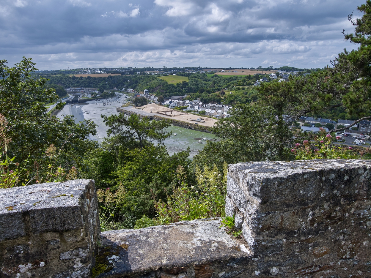 Vue du belvédère de jardin dit Tour Malakoff : parapet crénelé dans le style néo-gothique. En arrière-plan, le Port du LéguéImmatriculation