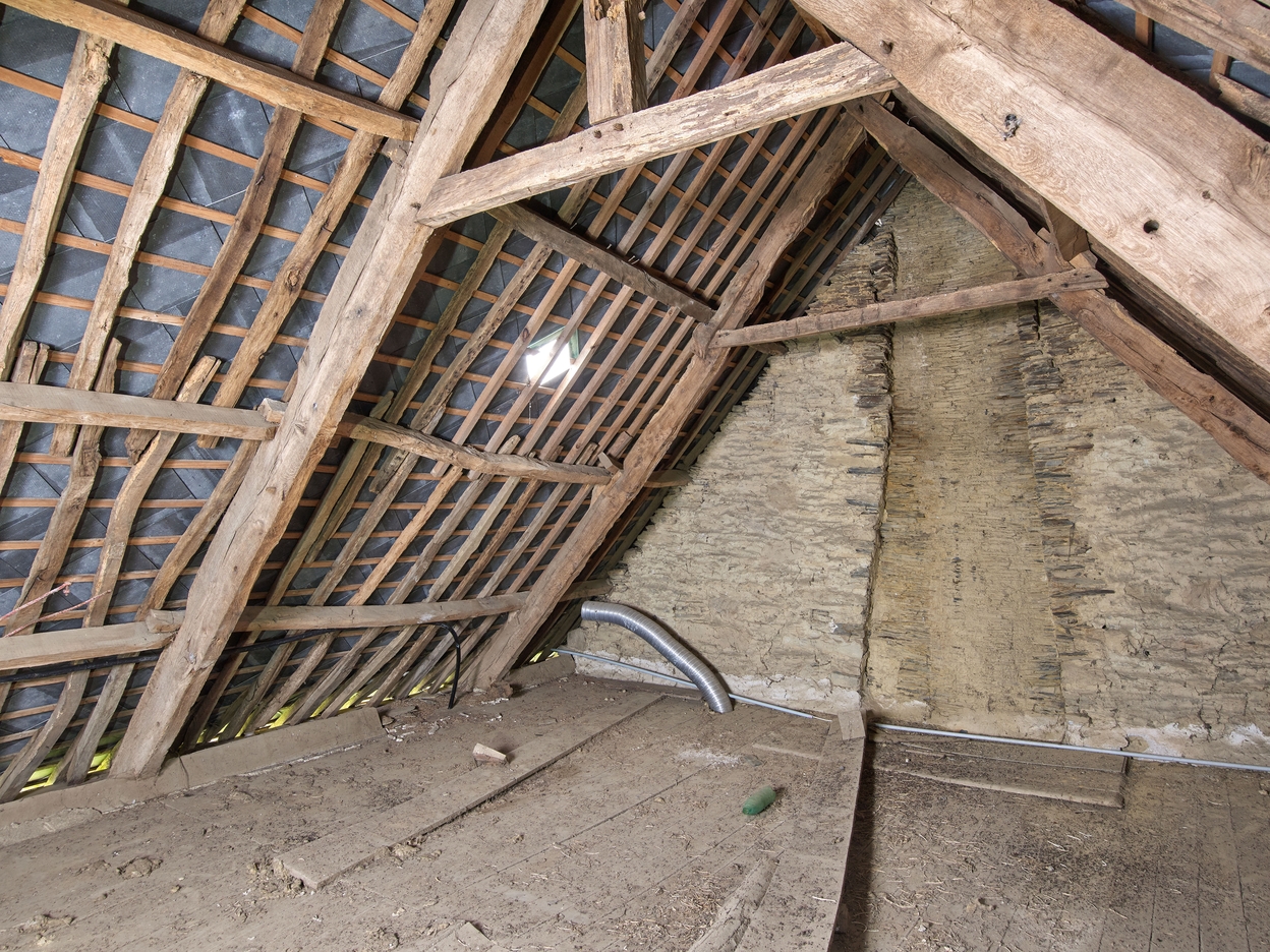 Logis 17e siècle. Comble au-dessus de la chambre à feu. Pignon avec vestiges du conduit de cheminéeImmatriculation