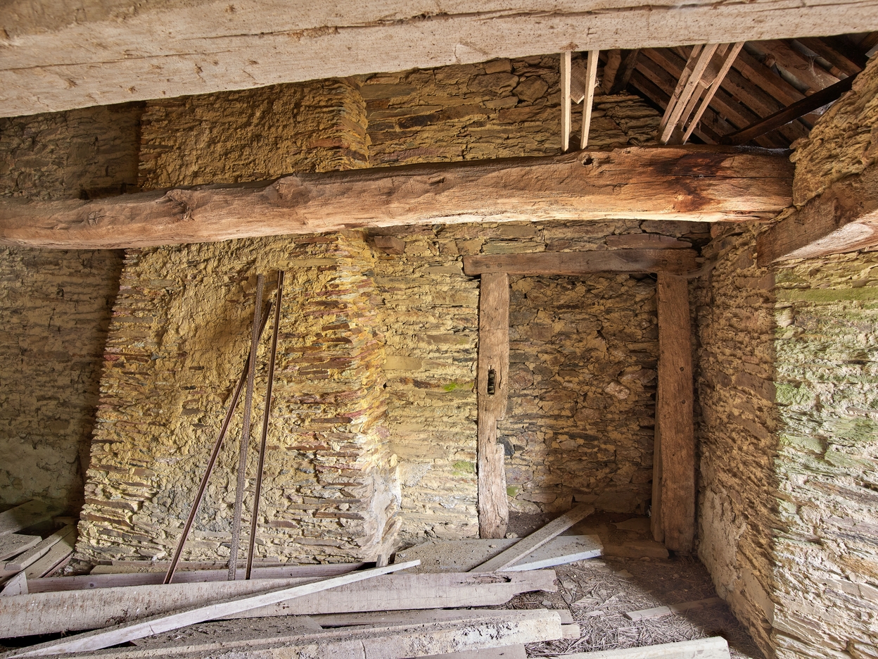 Logis 1706. Chambre haute. Pignon nord avec conduit de cheminée (de la salle) et porte d'accès à la dépendanceImmatriculation