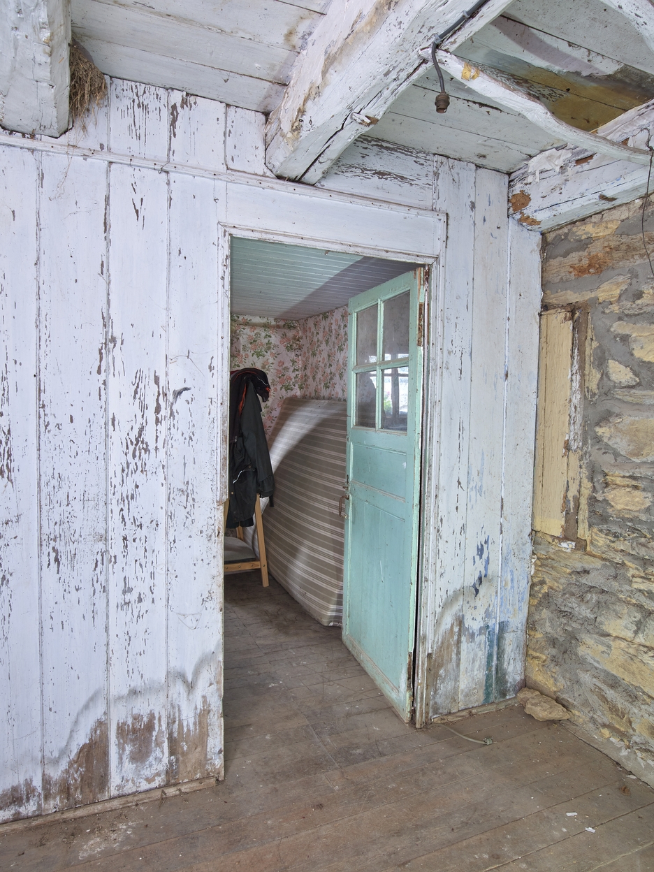 Logis 1673. Etage. Cloison en bois posée au 19e siècle. Placard mural aménagé dans le mur, coupé en deux par la cloisonImmatriculation