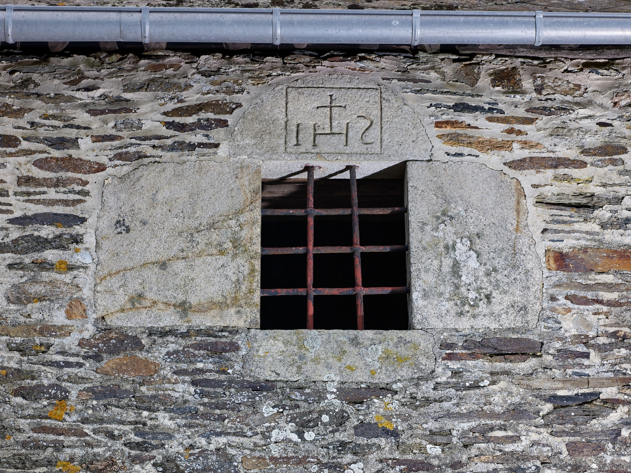 Logis 17e siècle. Elévation sud. Détail d'une baie à barreaux portant l'inscription IHSImmatriculation