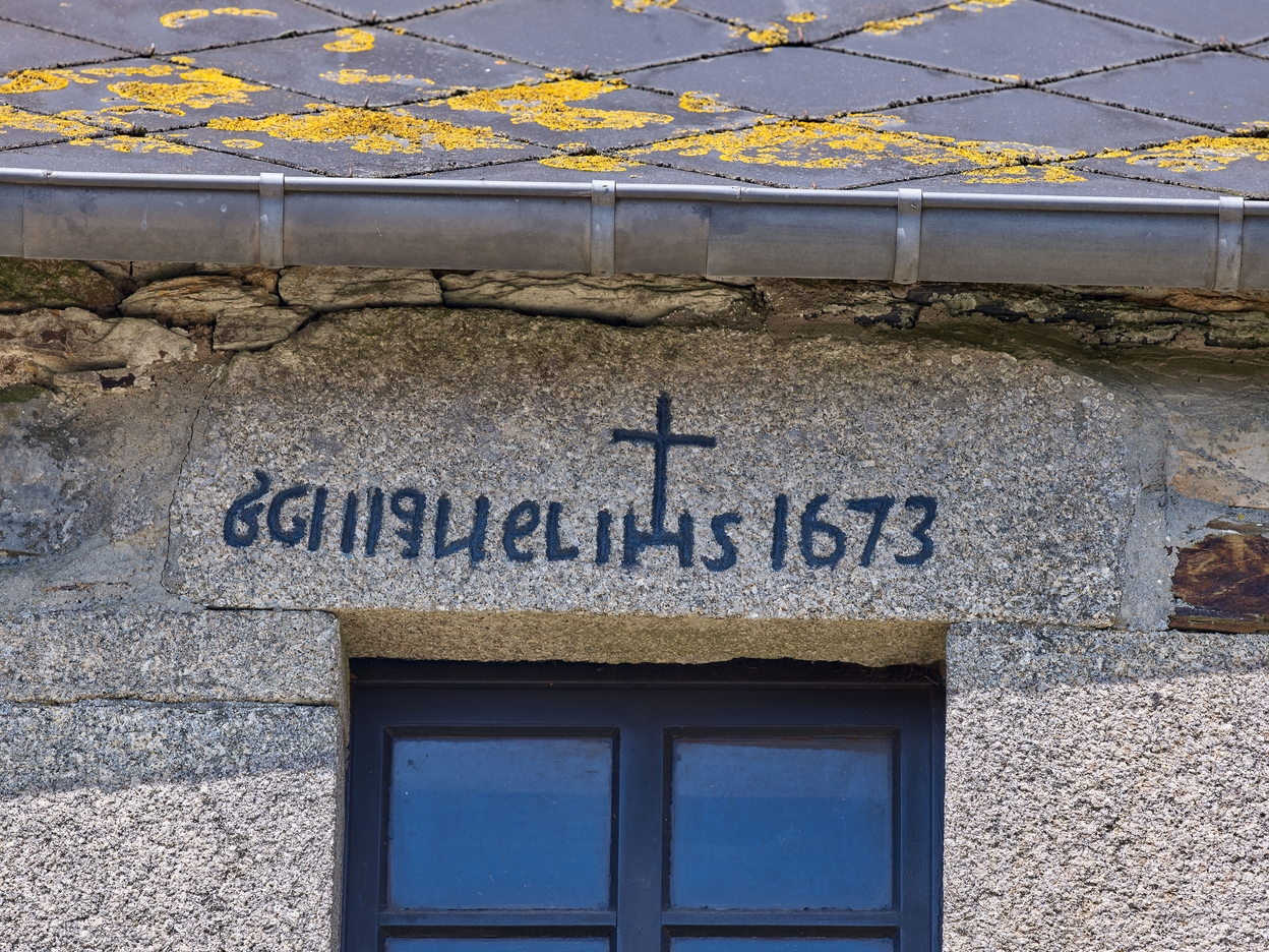 Logis 1673. Détail de la date et de l'inscription : G.GIQUEL ?Immatriculation