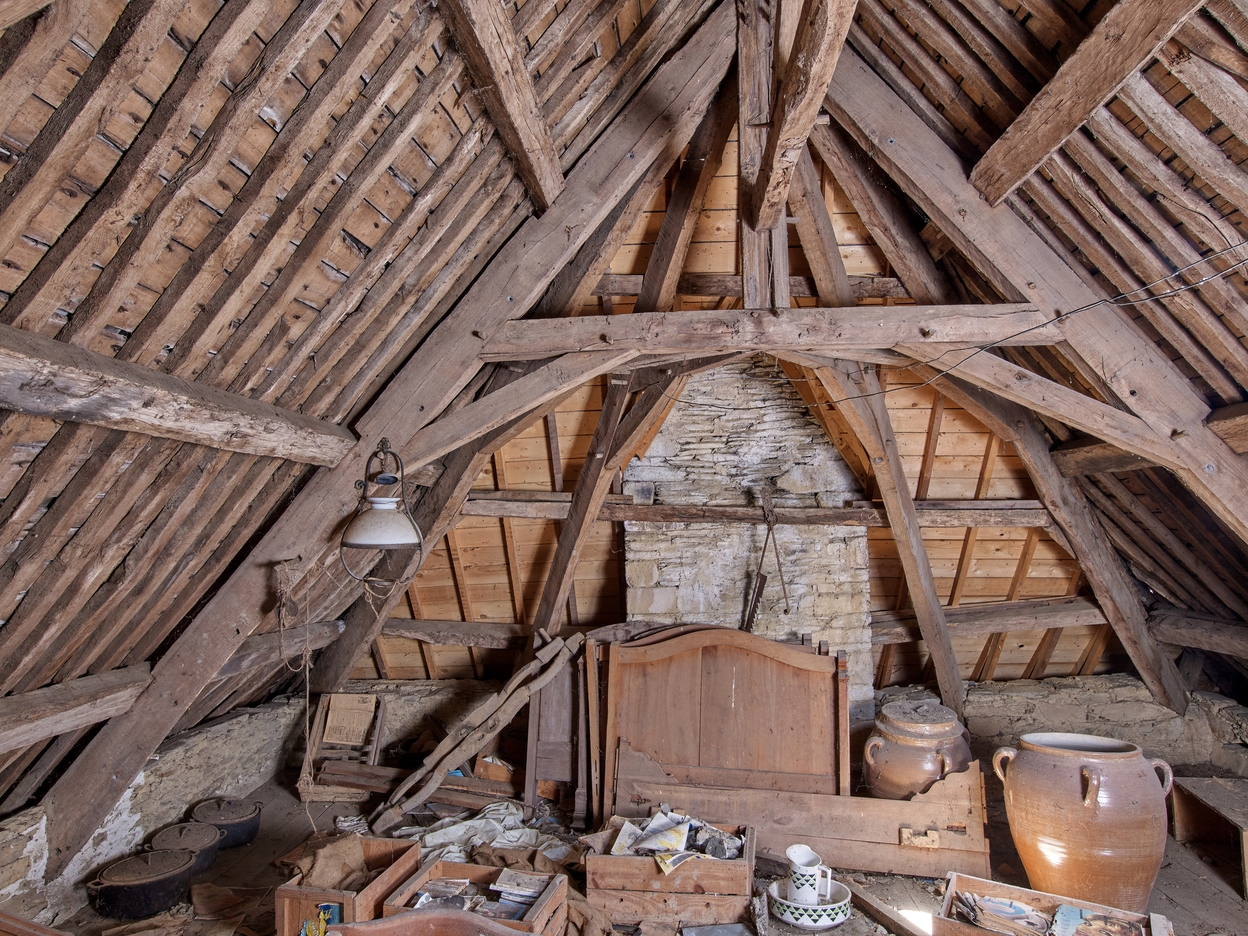 Logis. Charpente du comble. Partie est avec le conduit de cheminée et le plan à enrayure de la croupeImmatriculation