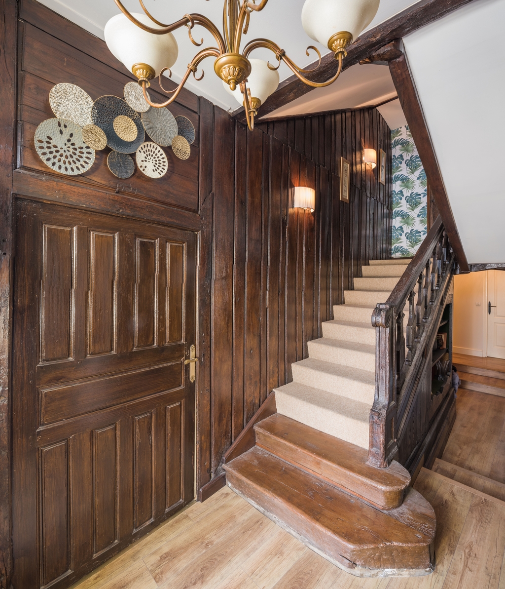 Logis. Vestibule d'entrée avec l'escalier tournant à retours construit entre le mur de refend et une cloison en menuiserie. Vue généraleImmatriculation