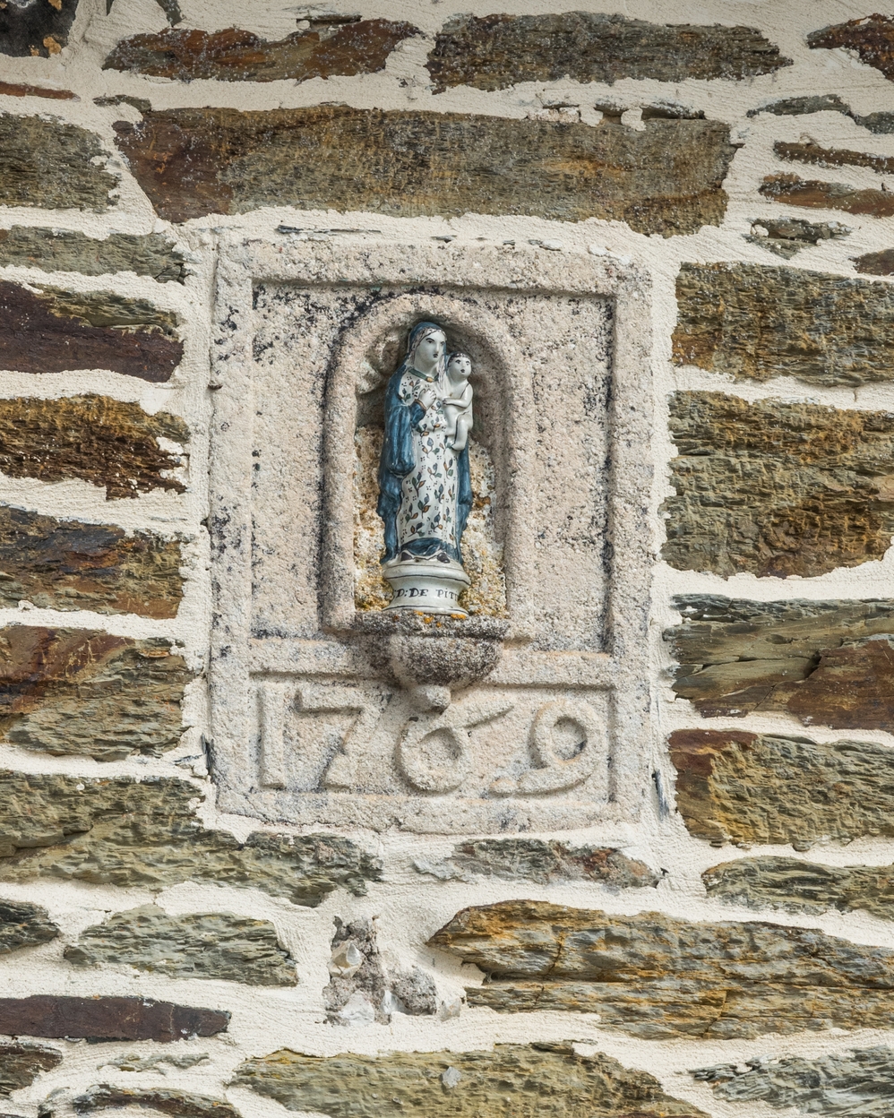 Logis. Elévation ouest. Détail de la niche à Vierge et de la date portée 1769Immatriculation