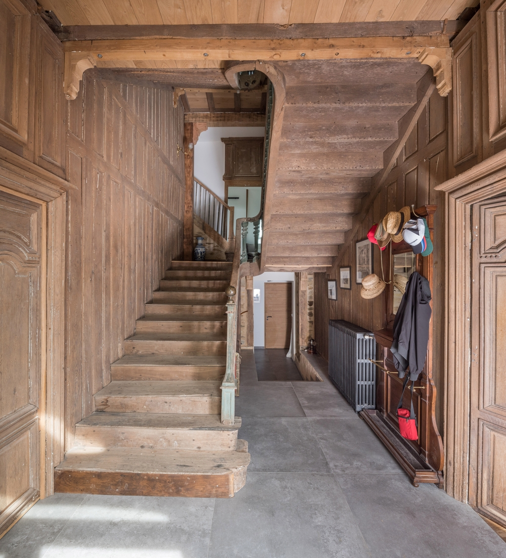 Logis, vestibule d'entrée, escalier construit entre deux cloisons de menuiserie, vue généraleImmatriculation