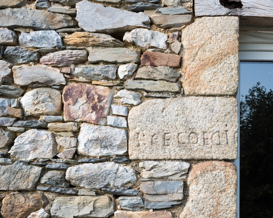 Logis de blanchisseurs. Fenêtre. Détail d'une inscription sur une pierre d'encadrement : "I : Le COEDICImmatriculation