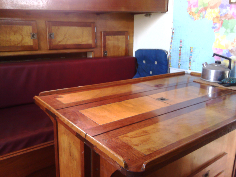 Glaz Mor : vue des emménagements, table, vernisImmatriculation