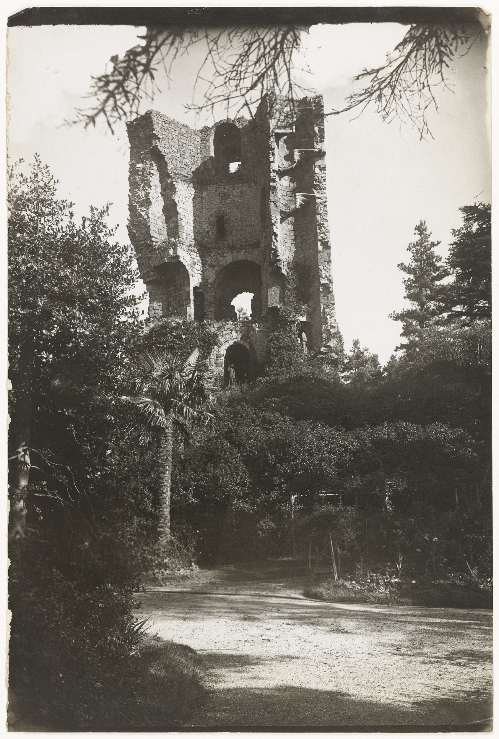 Vue générale. Au premier plan, le jardin avec un palmier chanvre (Trachycarpus fortunei). Une statue a été installée dans la tourImmatriculation
