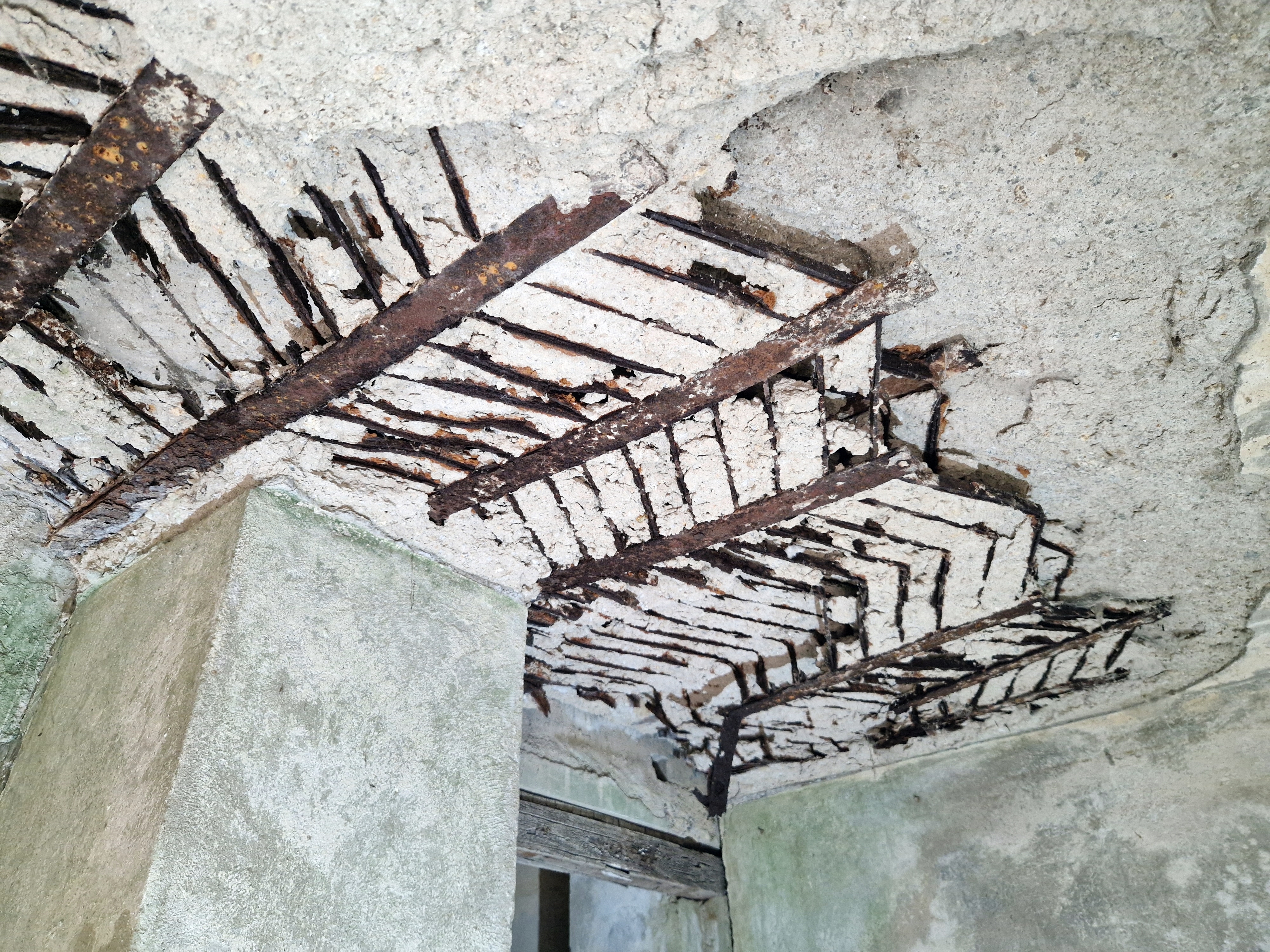 Vue du ferraillage de la dalle de couverture composé de grilles métalliques de roulement pour piste d’avionImmatriculation