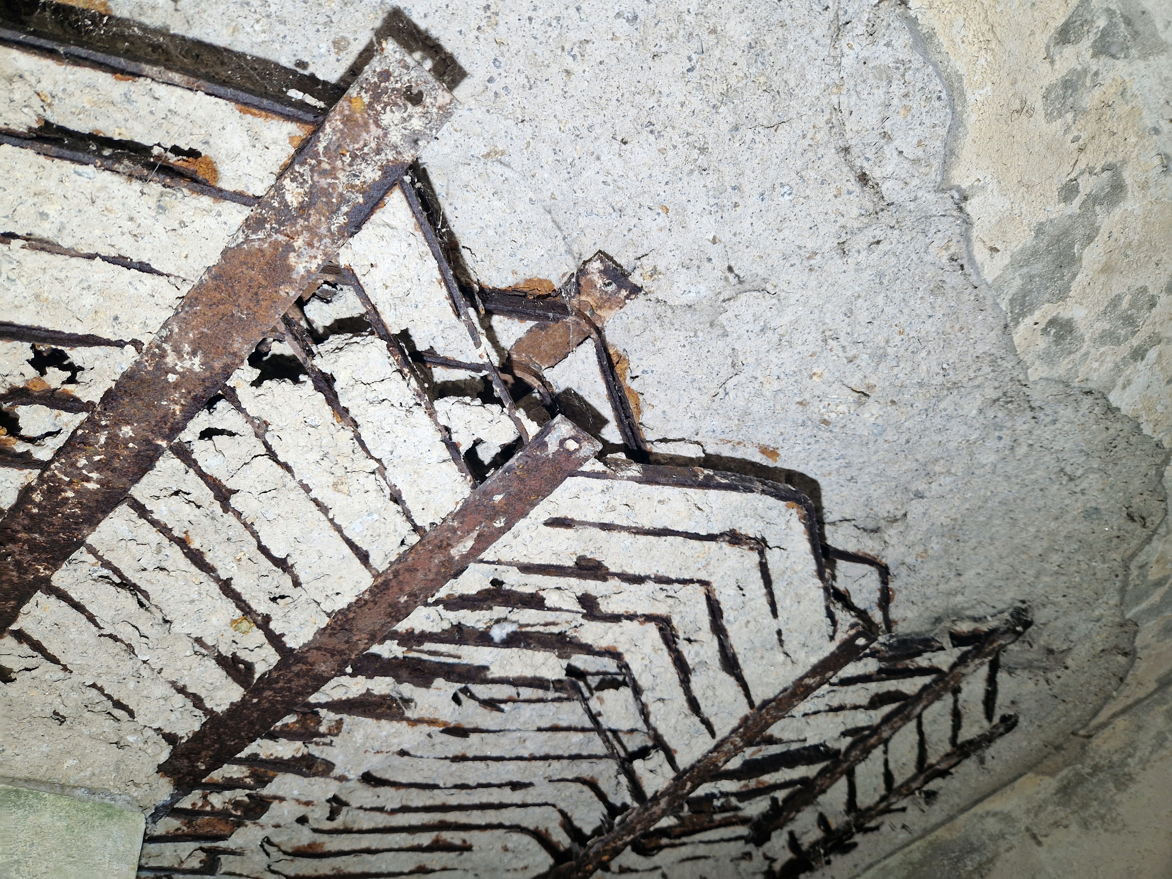 Vue du ferraillage de la dalle de couverture composé de grilles métalliques de roulement pour piste d’avionImmatriculation