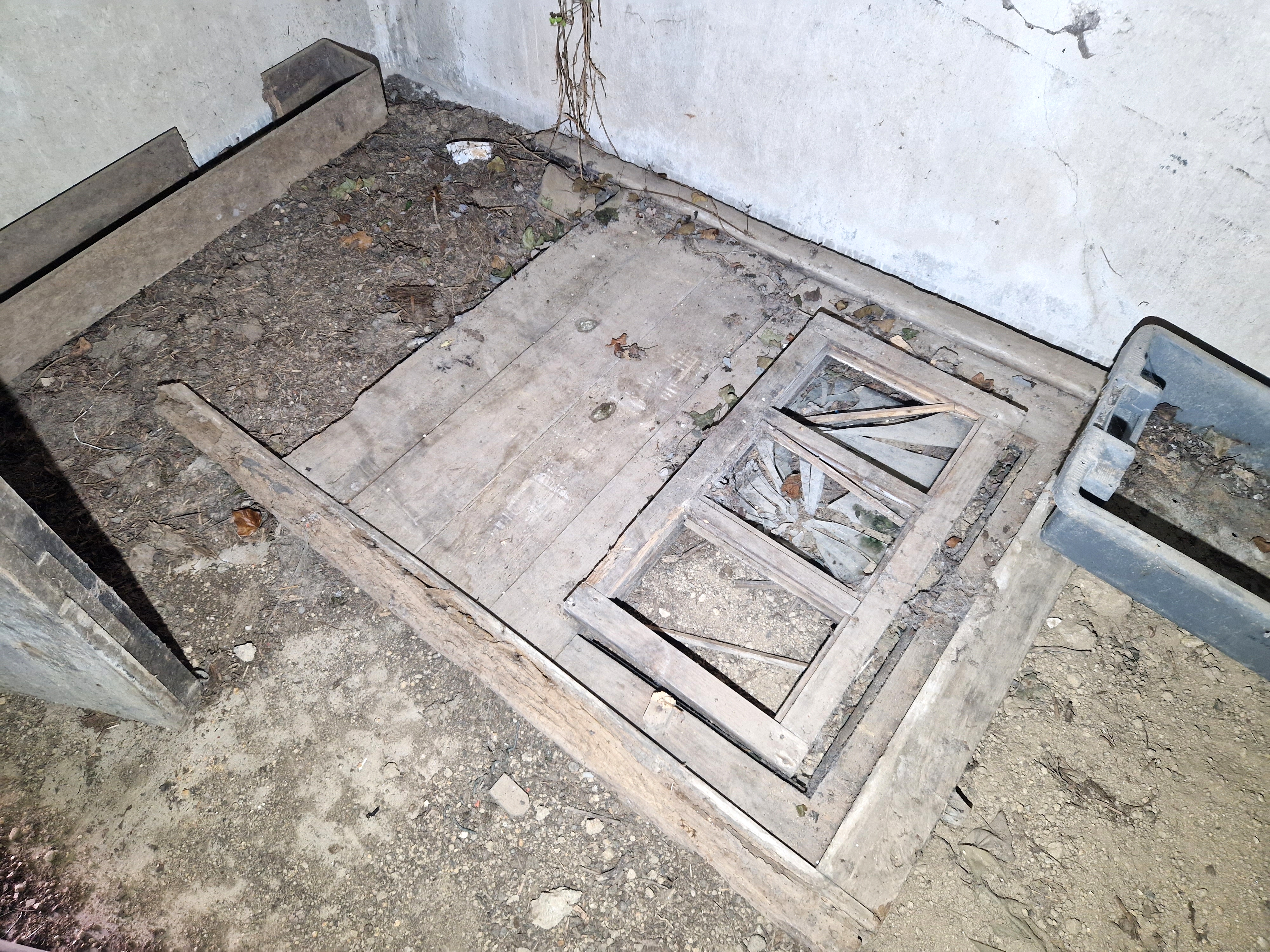 Vue de la porte en bois avec jours gisant au sol dans la pièce ouestImmatriculation