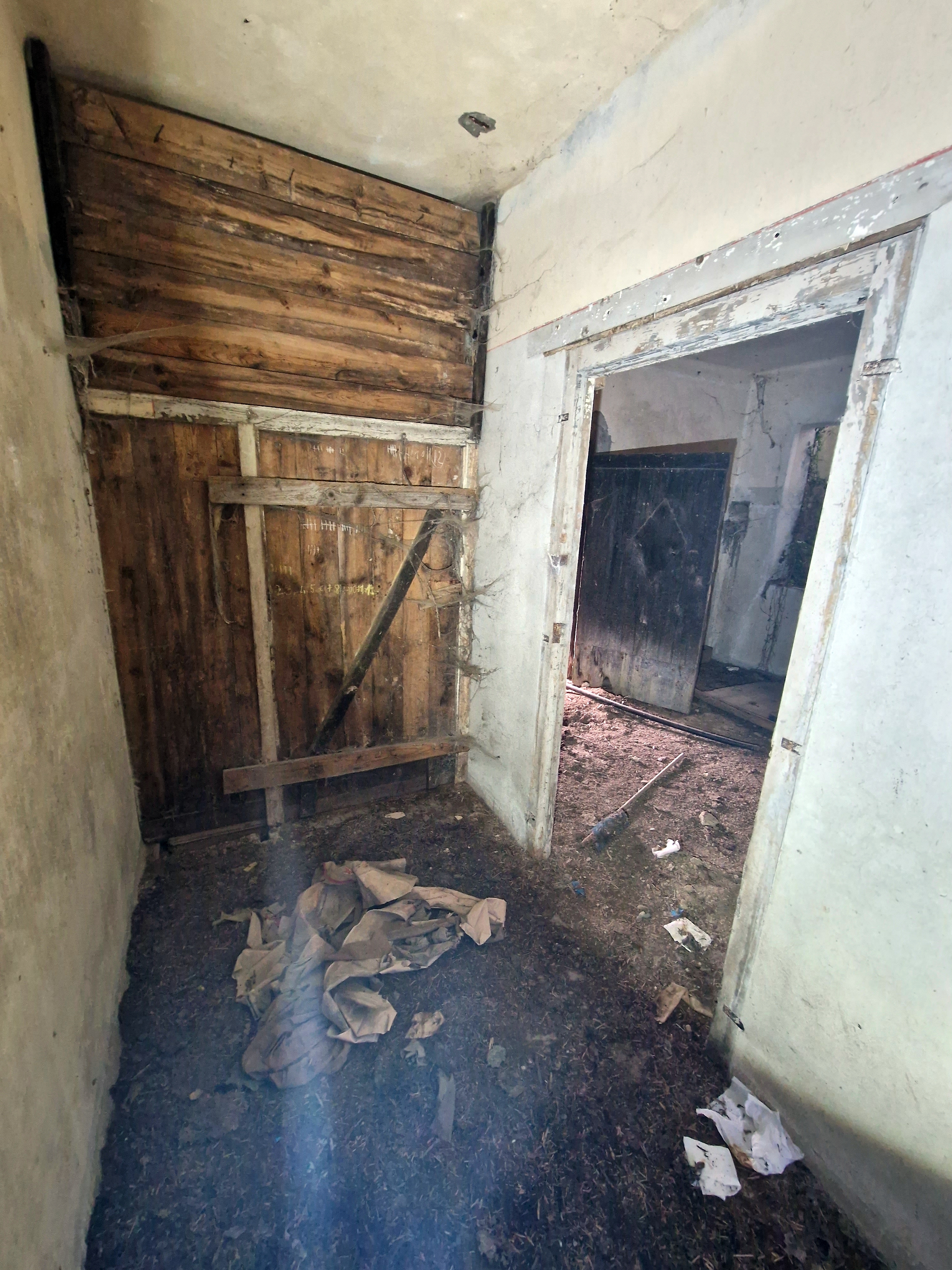 Vue du couloir est depuis l'intérieur : il est fermé par une porte en bois. A droite, la porte de la pièce ouestImmatriculation
