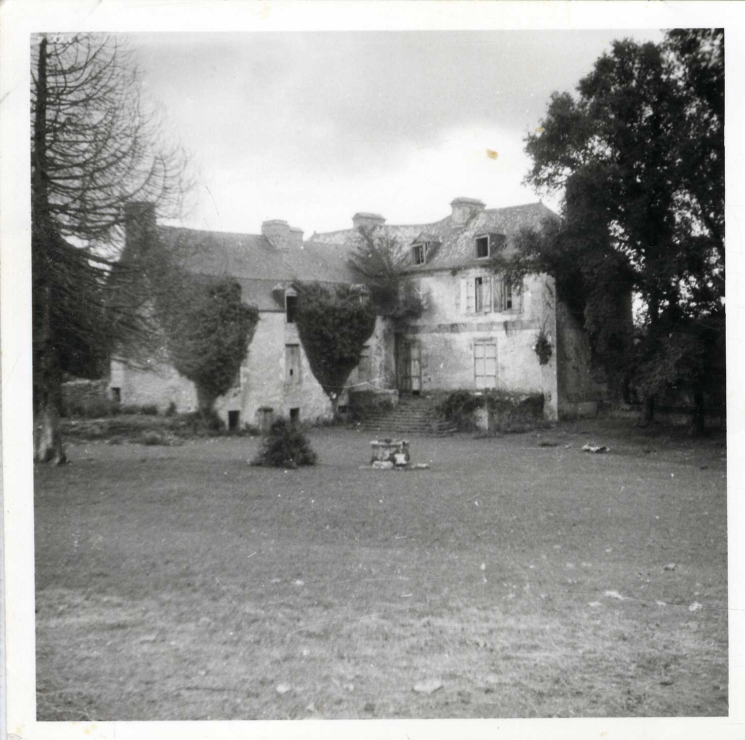 Vue du château de Quimerc'h (II) vers 1960 (Archives départementales du Finistère). Elévation nord du logis avec perron et aile nord (partiellement amputée). Au premier plan : puits. A cette date, le château apparaît ruiné (couverture du logis principal effondrée, lucarnes sans huisseries ; aile partiellement envahie par la végétation)Immatriculation