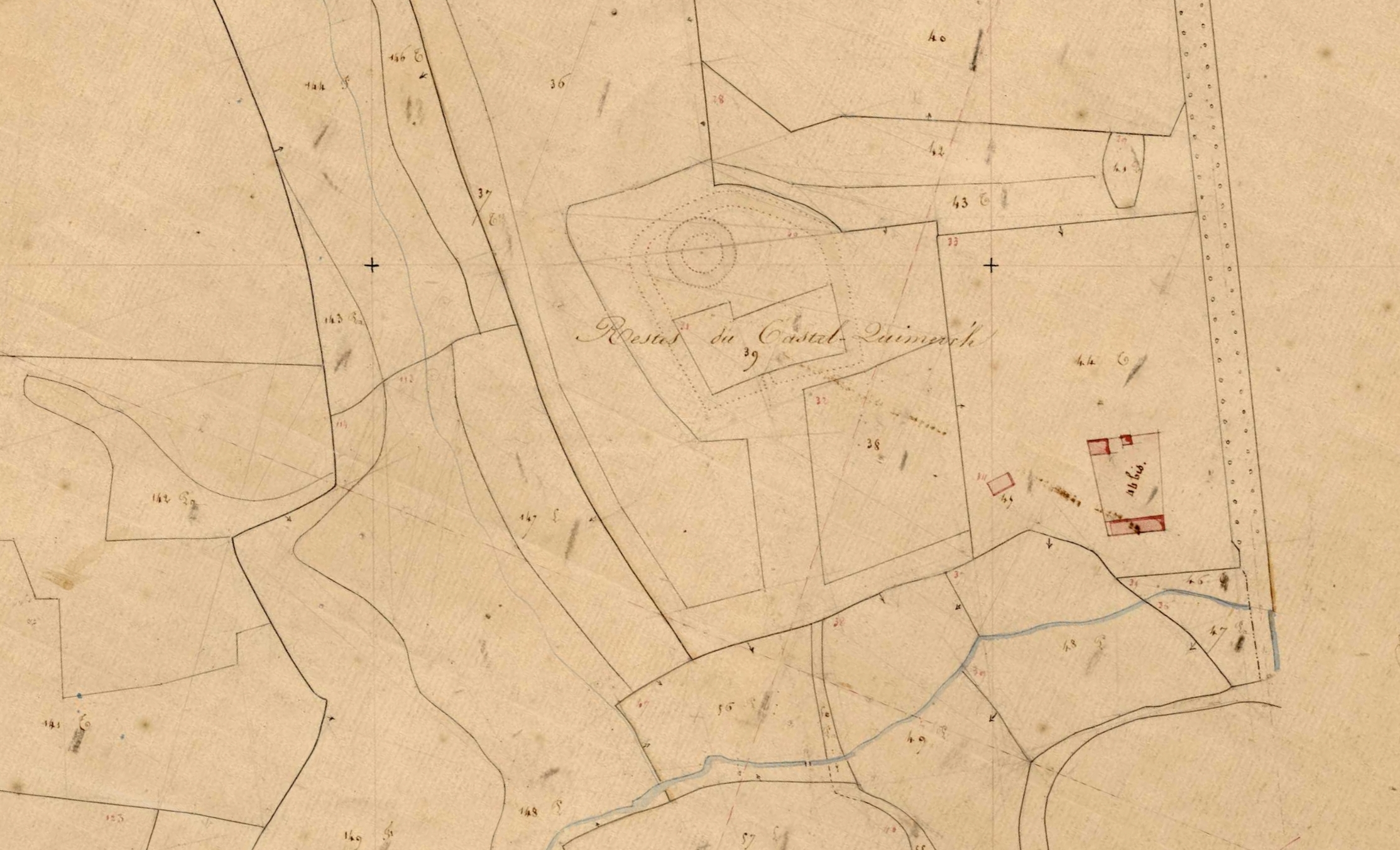Extrait du cadastre parcellaire de la commune de Bannelec, 1844 (section G1 de Kerneuzec, feuille 1) : emplacement de la motte de Castel-Quimerc'hImmatriculation