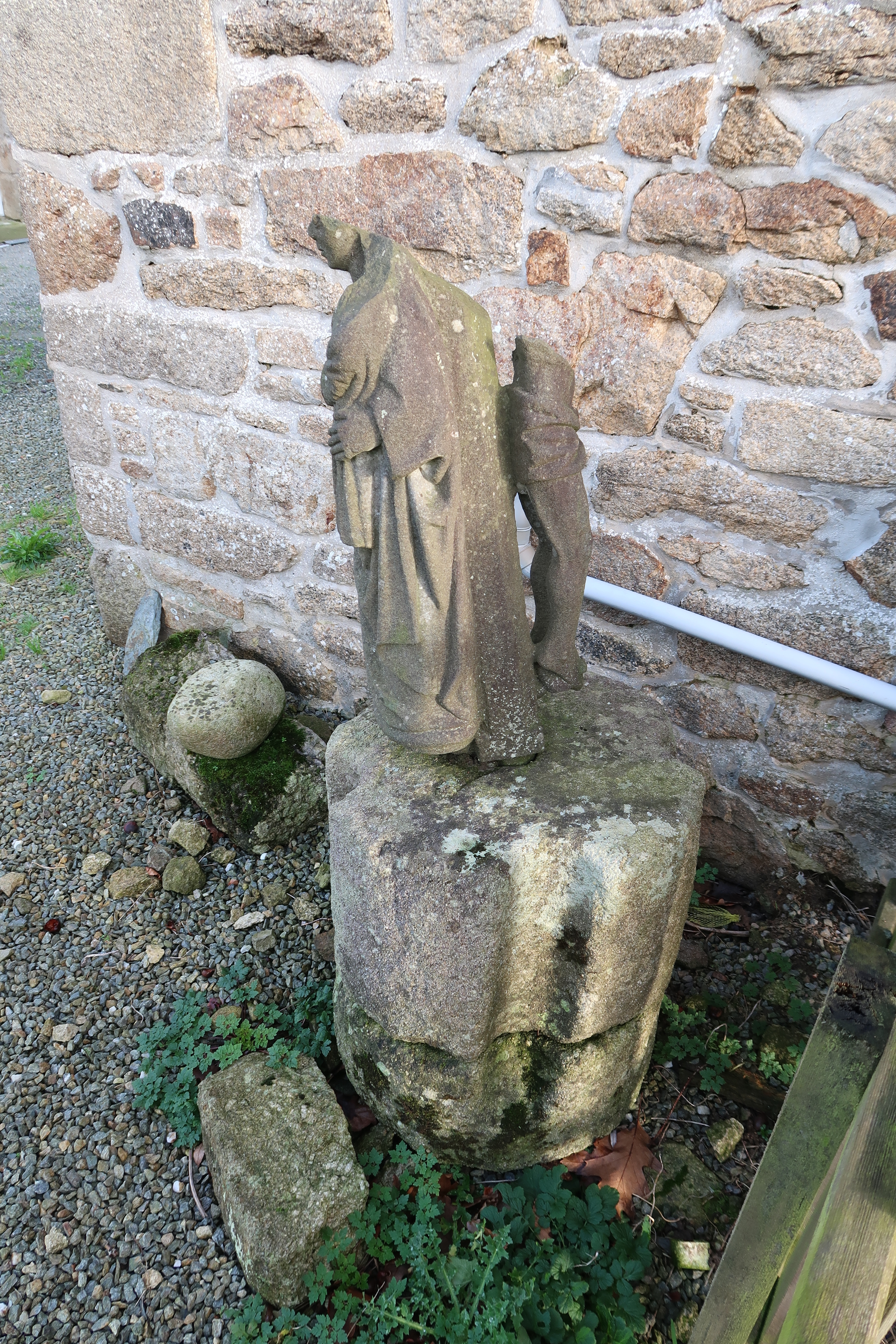 Vue de la statue sommitale en kersanton d'origine du calvaire : Christ à l’avers et Vierge à l’Enfant au reversImmatriculation
