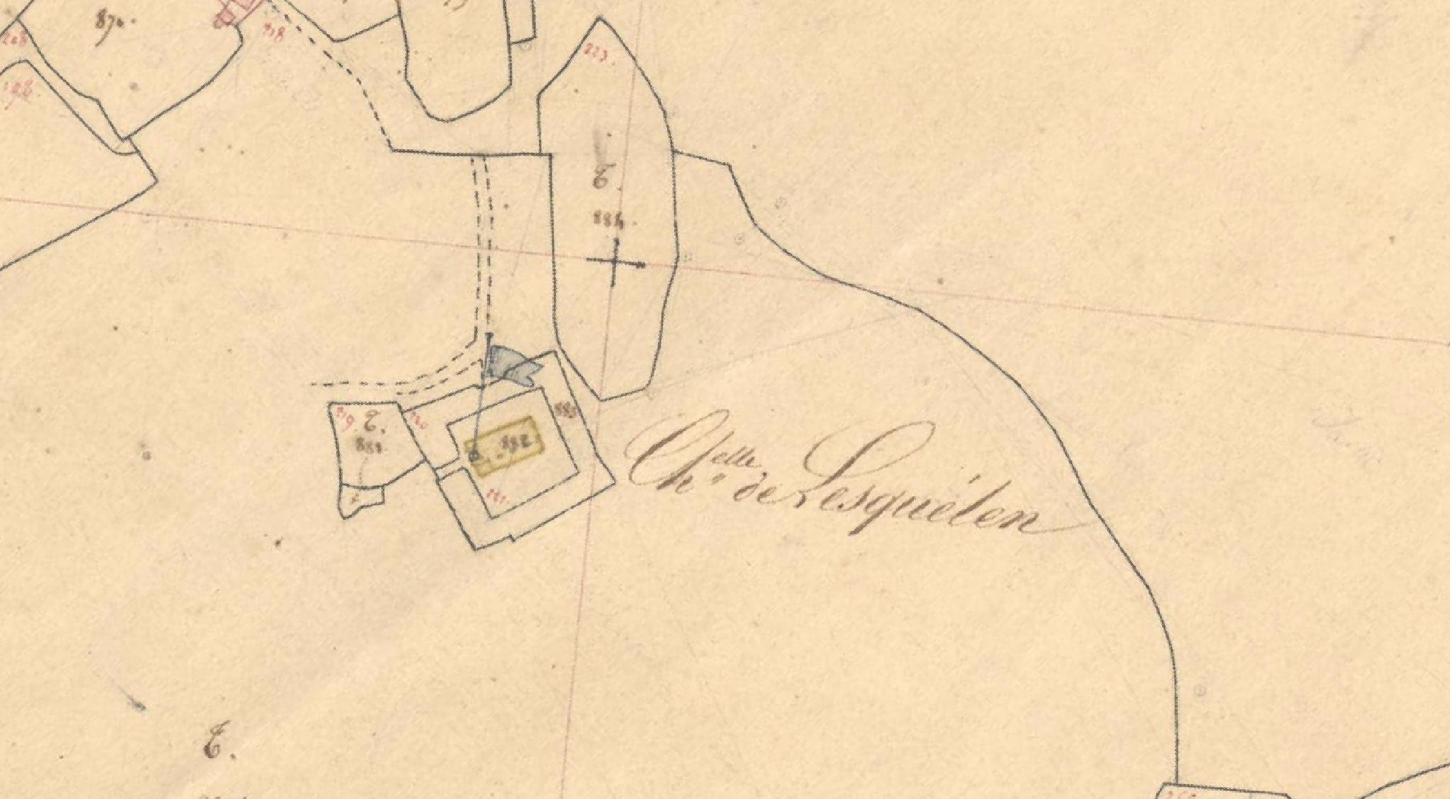 Extrait du cadastre parcellaire, section E de Lesquelen, feuille 2, 1831 : chapelle (couleur jaune) et placître. Son clocher a servi de point de repère à la réalisation du cadastre parcellaire comme l’atteste la représentation d’un pavillon de couleur bleu et son mâtImmatriculation