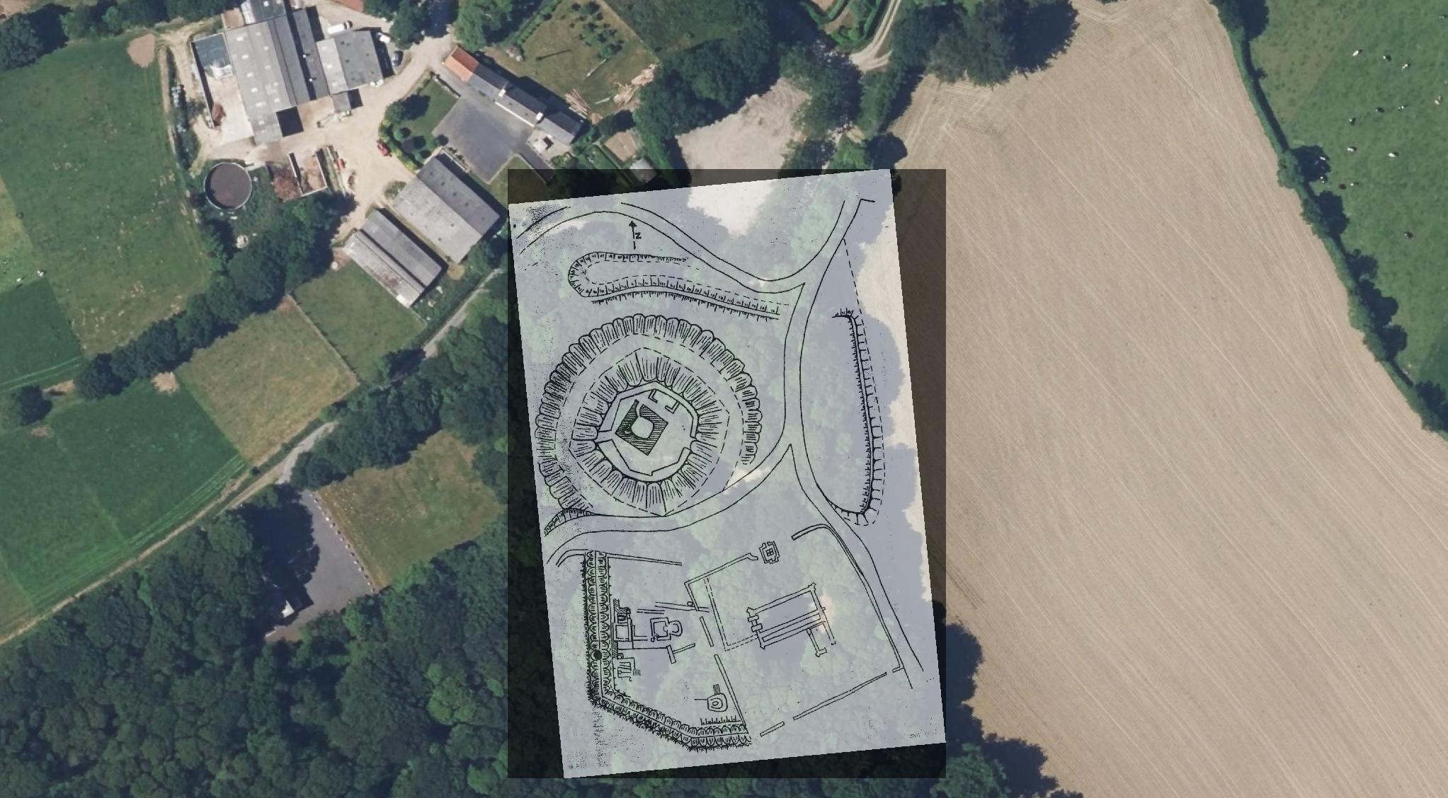 Vue aérienne verticale de 2021 et croquis du site archéologique de Lesquélen inspiré des relevés archéologiques de Joseph Irien, version géoréférencée (source GéoBretagne ; dessin : Patrick Kernévez)Immatriculation