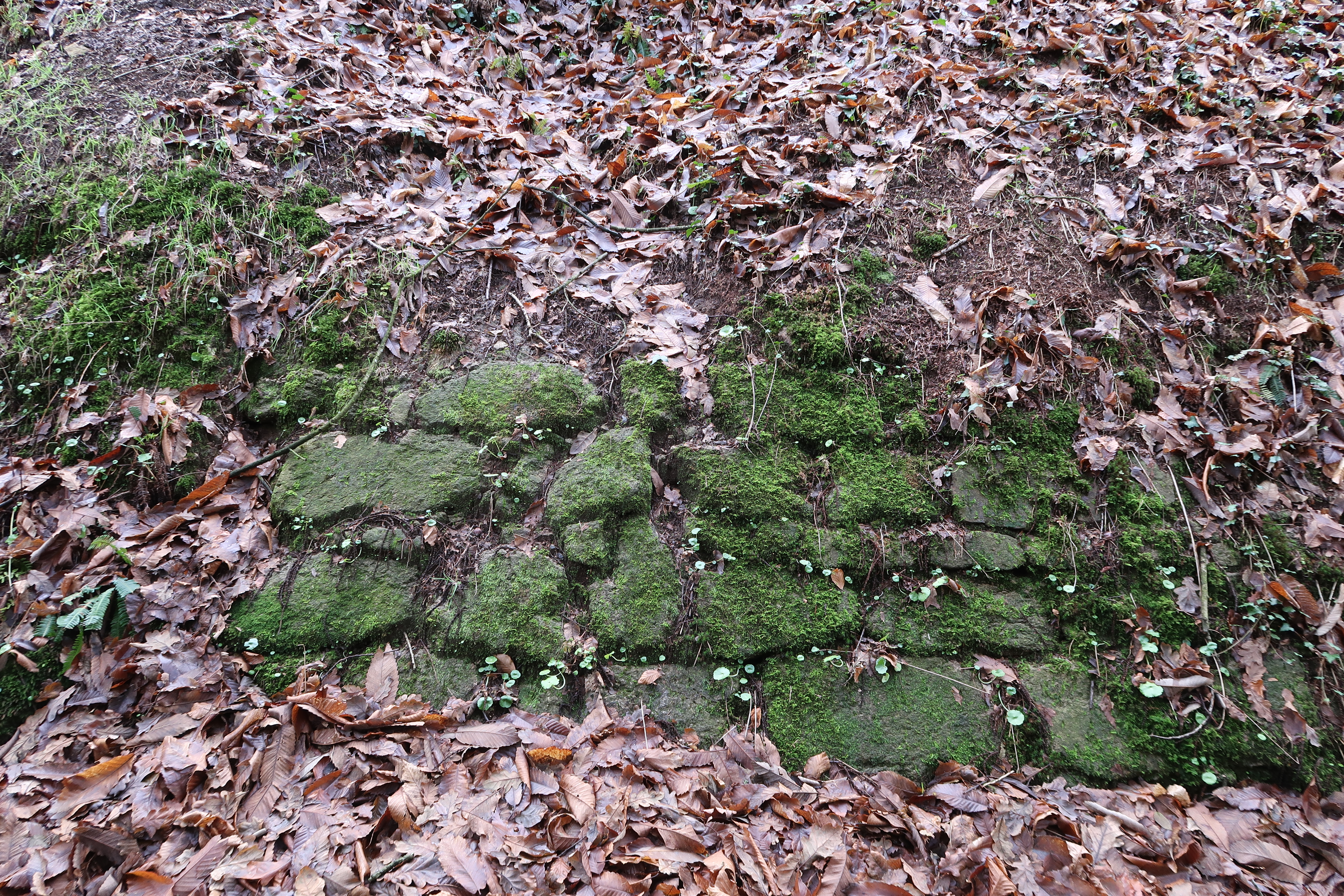 Vue de détail de la motte, état dans l'hiver 2023. La partie basse de ces flancs est partiellement appareillée de moellon : ici, le nordImmatriculation