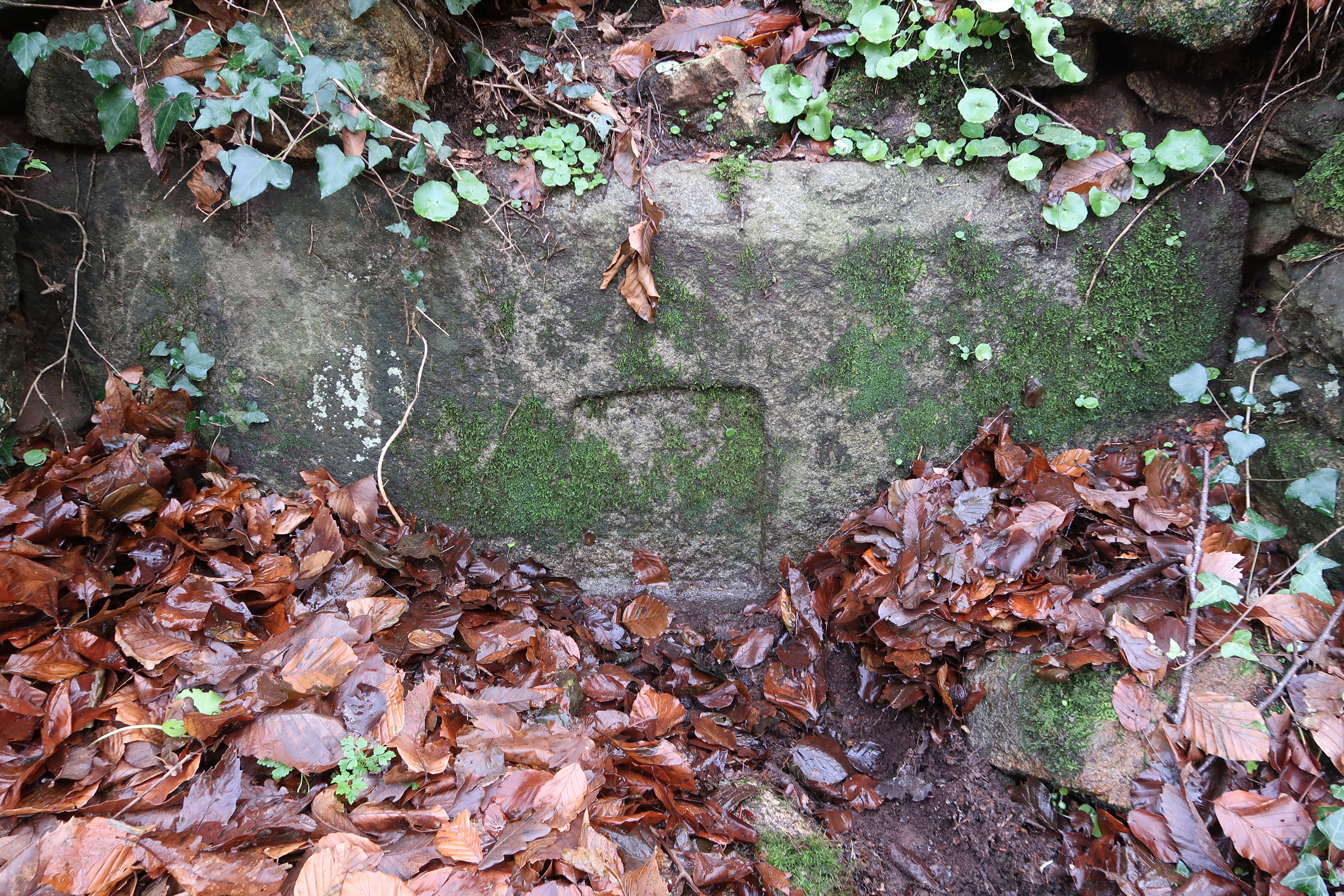 Vue de détail du mur de clôture du placître de la chapelle : pierre de taille avec emplacement pour des armoiries (élément déplacé)Immatriculation