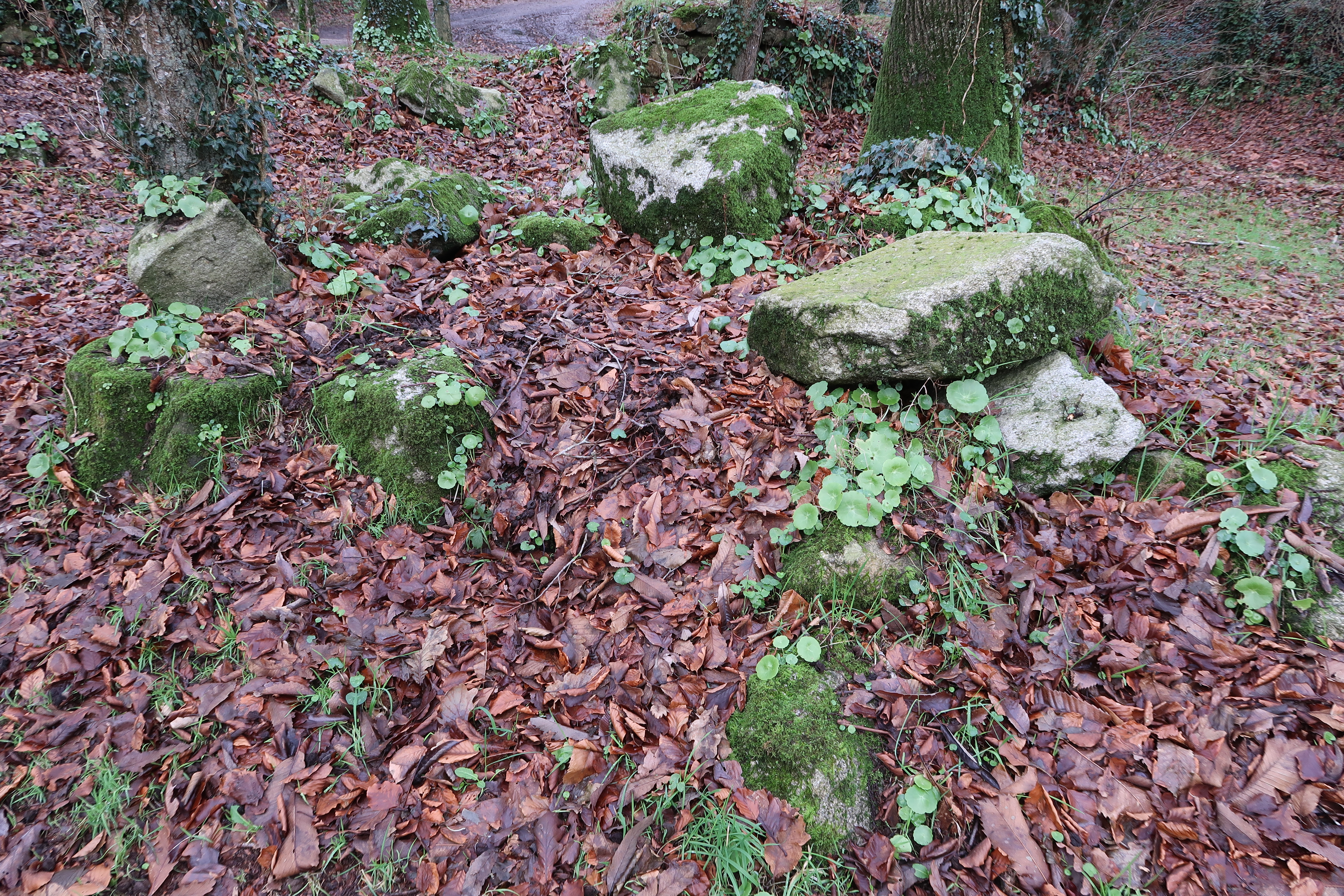 Vue du dépot lapidaire situé à côté du calvaire, état dans l'hiver 2023Immatriculation