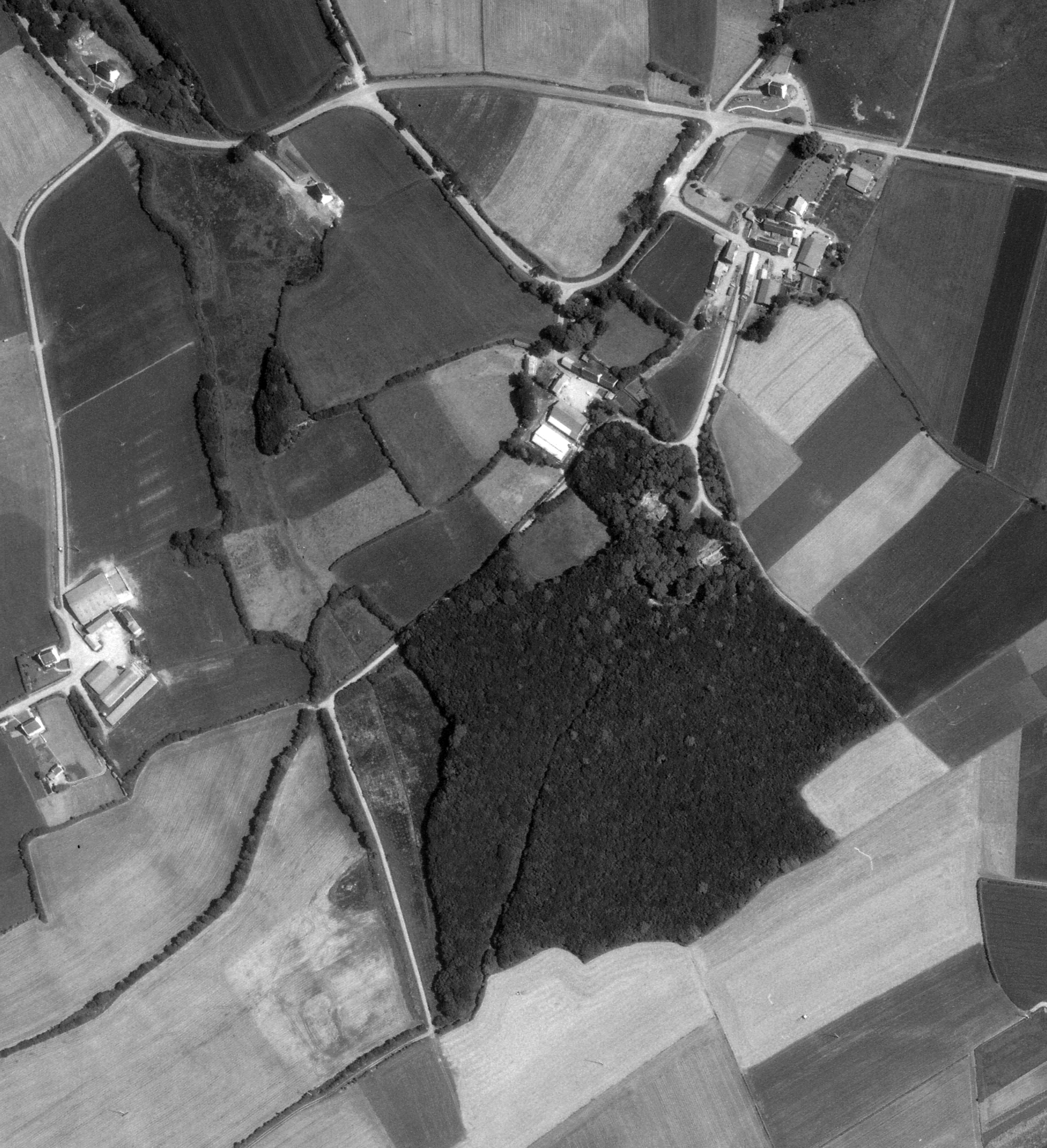 Vue aérienne verticale, 1977. On aperçoit l'emprise des fouilles archéologiques (chapelle et motte)Immatriculation