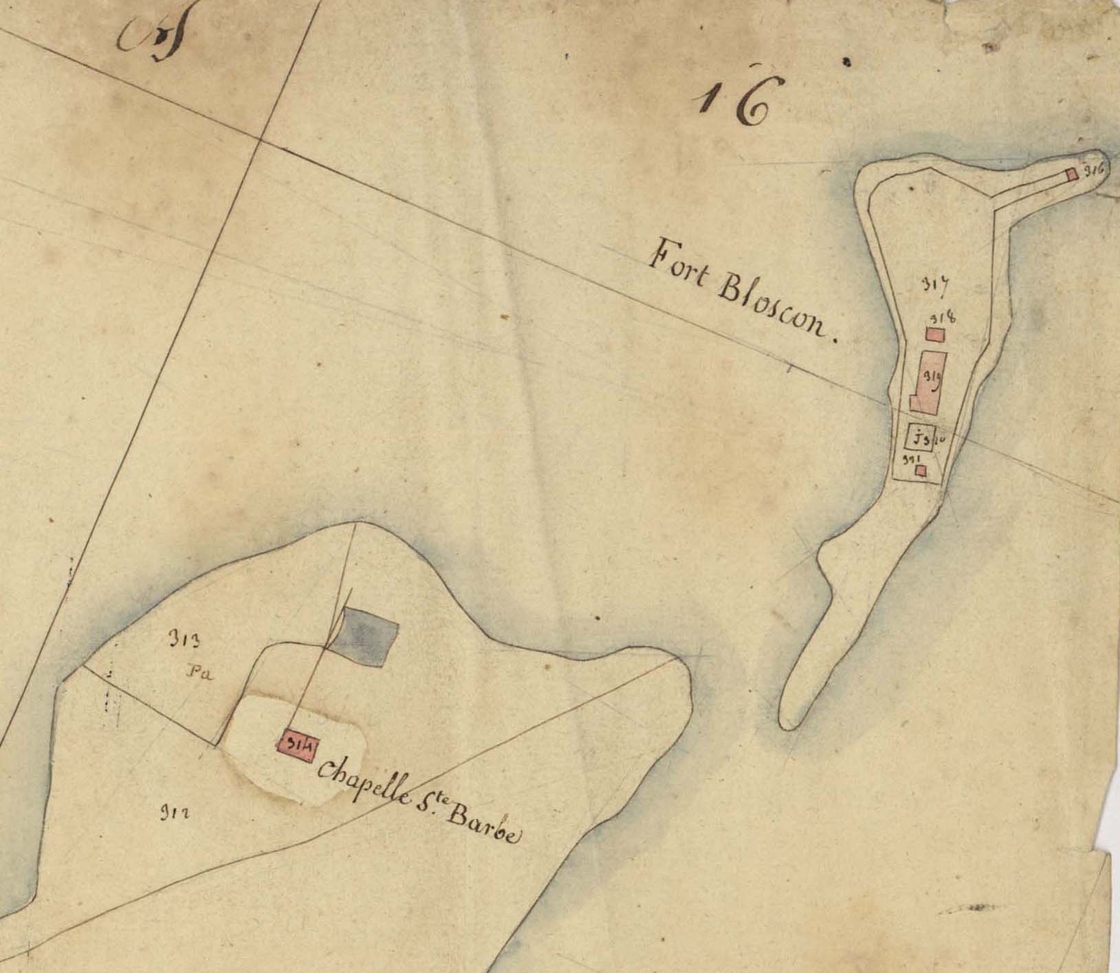Extrait du cadastre parcellaire de Roscoff : chapelle Sainte-Barbe et fort Bloscon, 1809Immatriculation