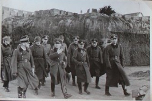 Vue de l'inspection du Mur de l'Atlantique à Roscoff par le Generalfeldmarschall Erwin Rommel le dimanche 23 janvier 1944 (littoral de Sibiril jusqu'à Paimpol, secteur de la 266e division d'infanterie commandée par le Generalleutnant Karl Spang). Le groupe passe devant le bunkerImmatriculation