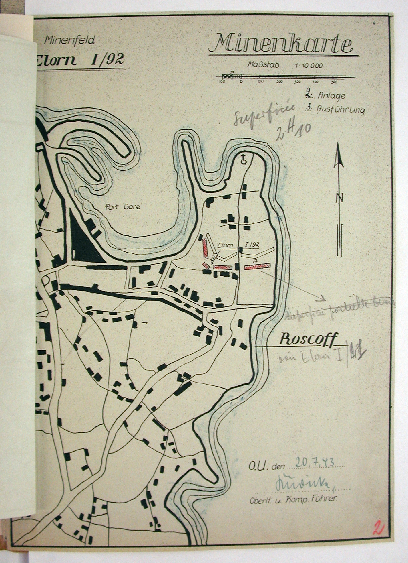 Plan du champs de mines Elorn I/92 divisée en deux sections A et B posé le 20 juillet 1943 (3./Pi./Btl. 371 : 42294D)Immatriculation