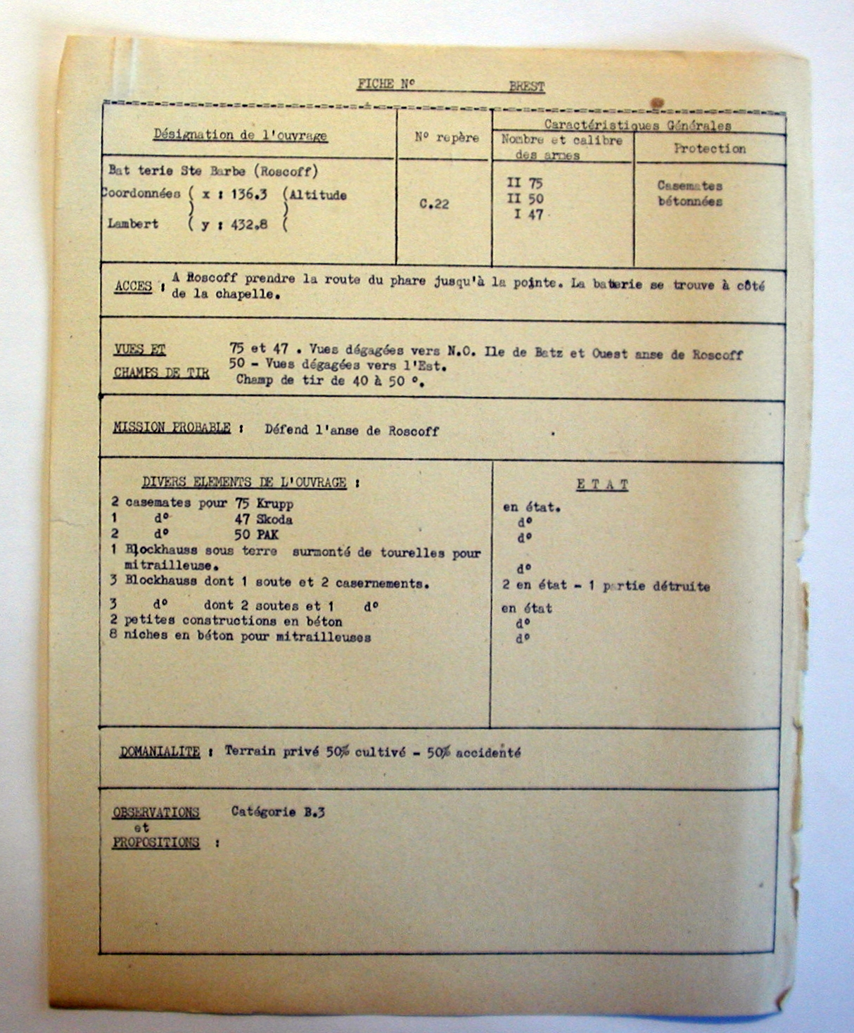 Archives concernant les ouvrages du Mur de l'Atlantique : circulaires, courriers, fiches d'inventaire...