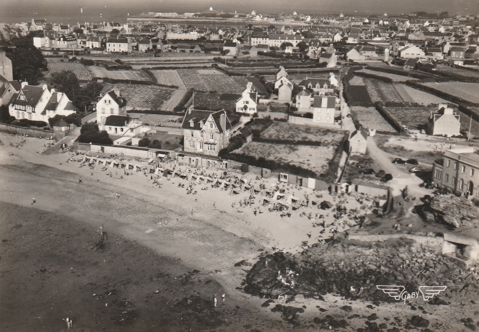 Vue aérienne oblique de l'Institut marin à Roscoff, établissement de thalassothérapie et de la plage de Roc'h Kroum, carte postale (éditions Gaby). En bas, à l'extreme droite : le bunker - casemate de type 676 implanté au pied du chaos granitiqueImmatriculation